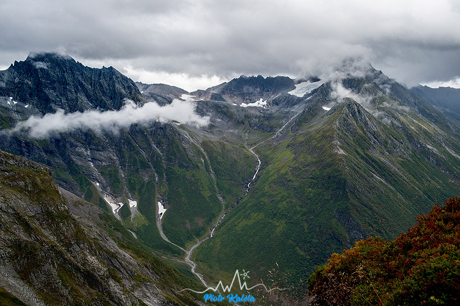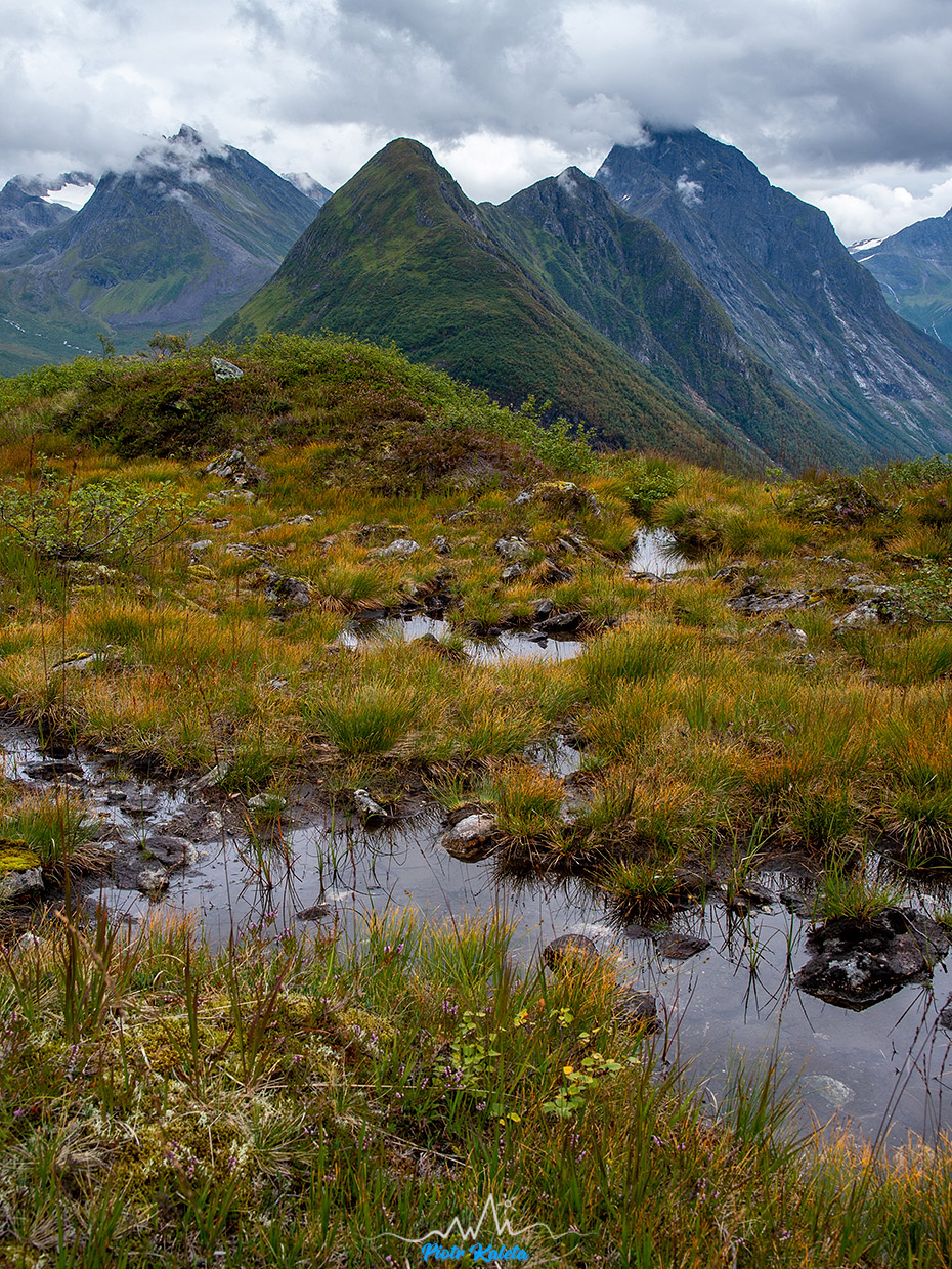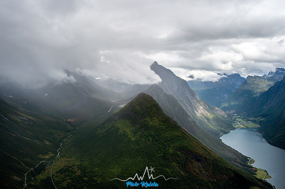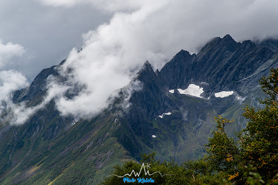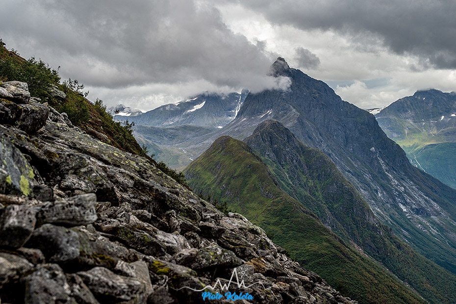 A to już widok na jeszcze inny zakątek fiordu: masywy Dalegubben (1344 m) i Holmshornet (1198 m).