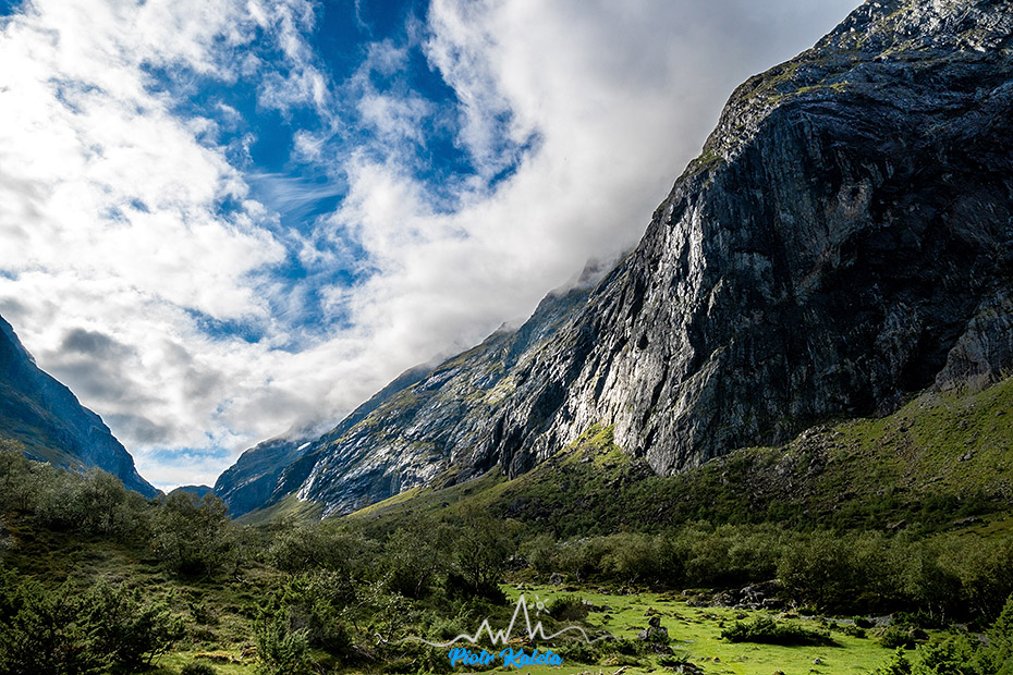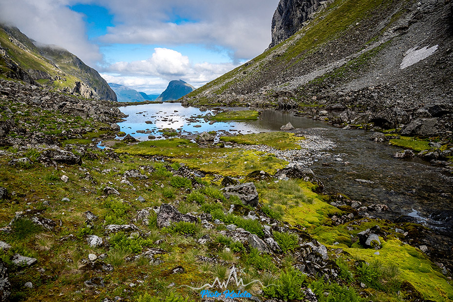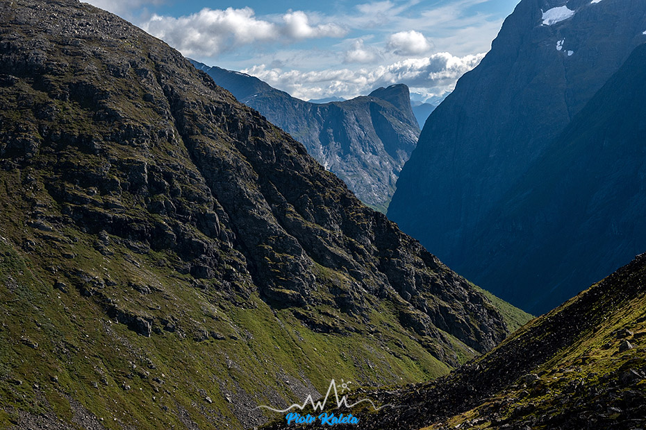 Podchodząc na przełęcz z której startuje szlak na Slogen otwiera się zacny widok na – jeżeli dobrze rozpoznałem – Fivelstadnibba (1209 m)