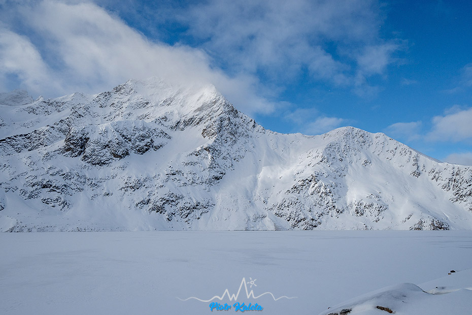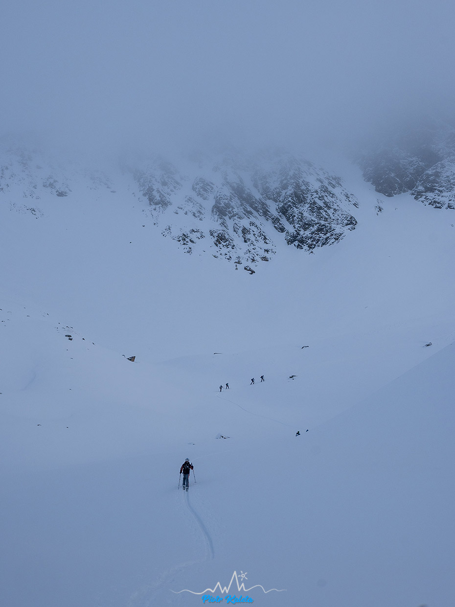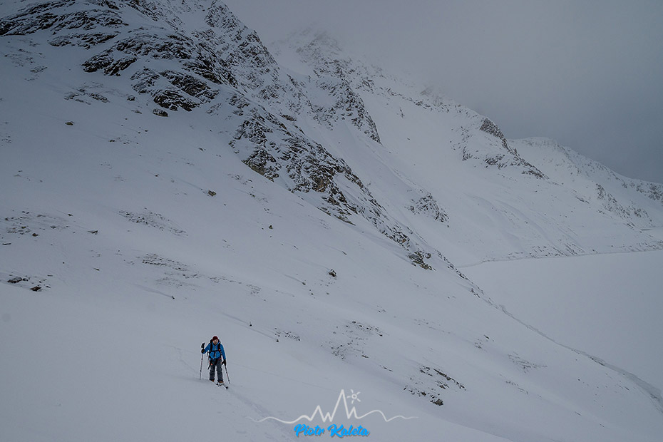 Zawsze gdy byłem tu wcześniej intrygowało mnie co takiego skrywa widoczny z przełęczy wał zbiornika zaporowego. No i tym razem się udało uszczknąć nieco z tej tajemnicy 🙂 Warunki śnieżne trafiają się dobre, bo przyjeżdżamy tu tuż po większym opadzie. Natomiast widoczność nie rozpieszcza. Było tak jak widać poniżej.