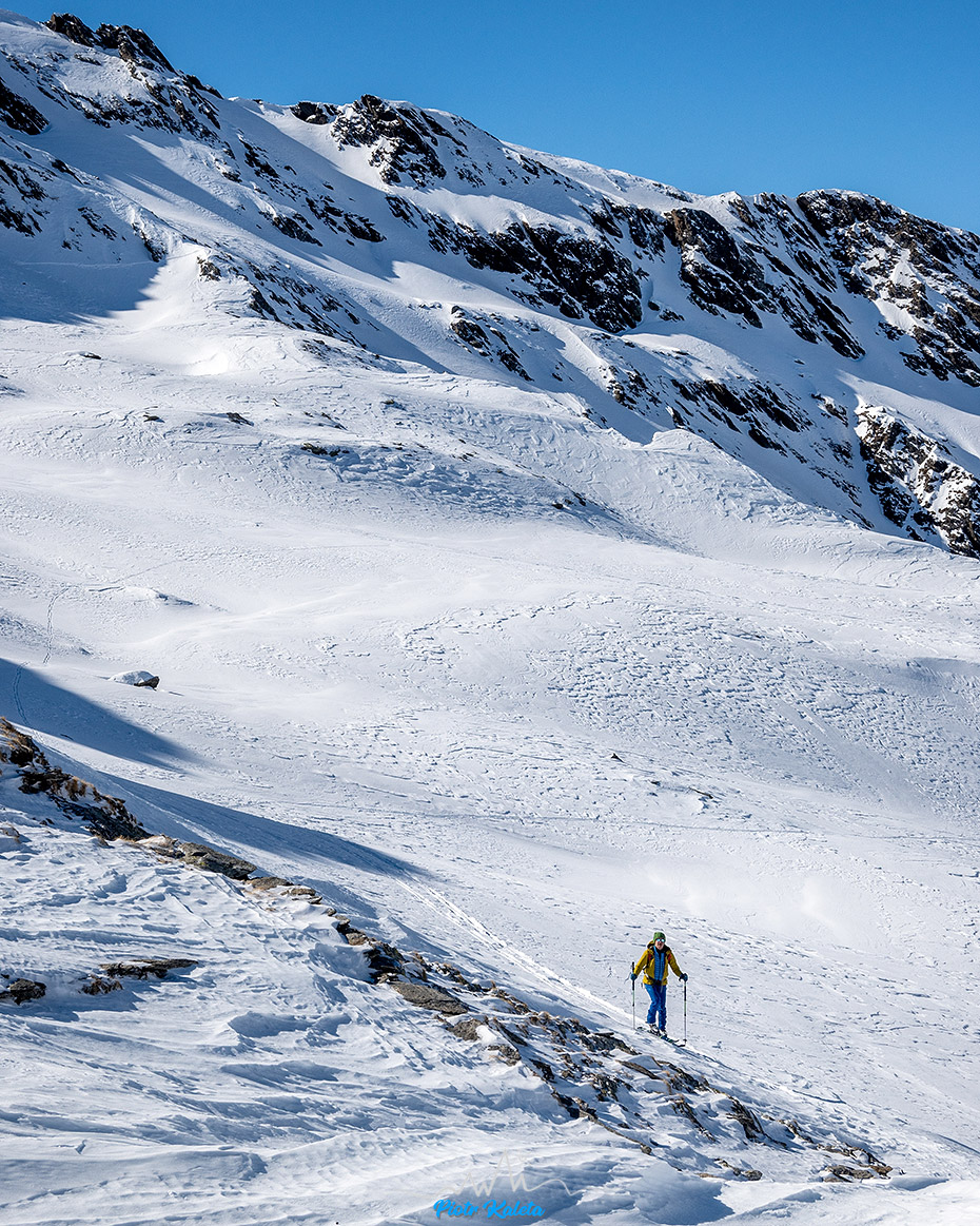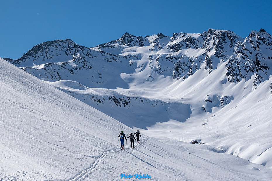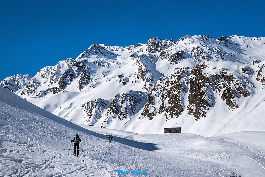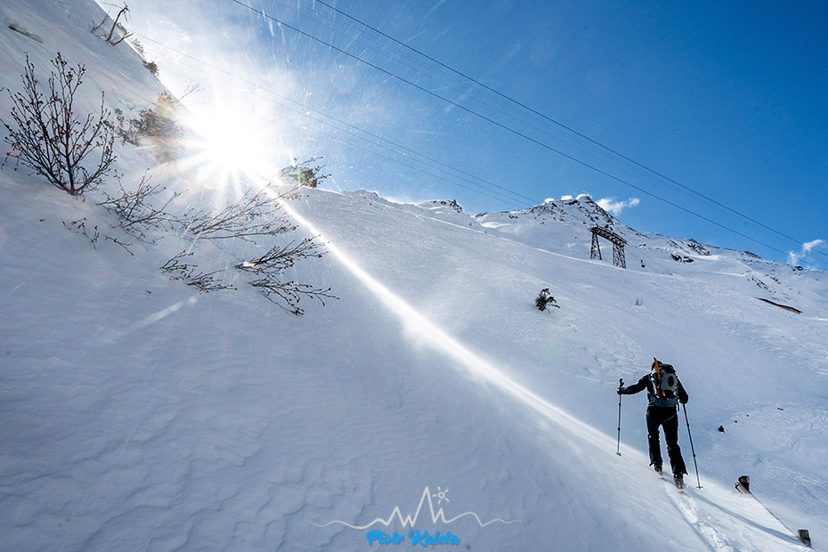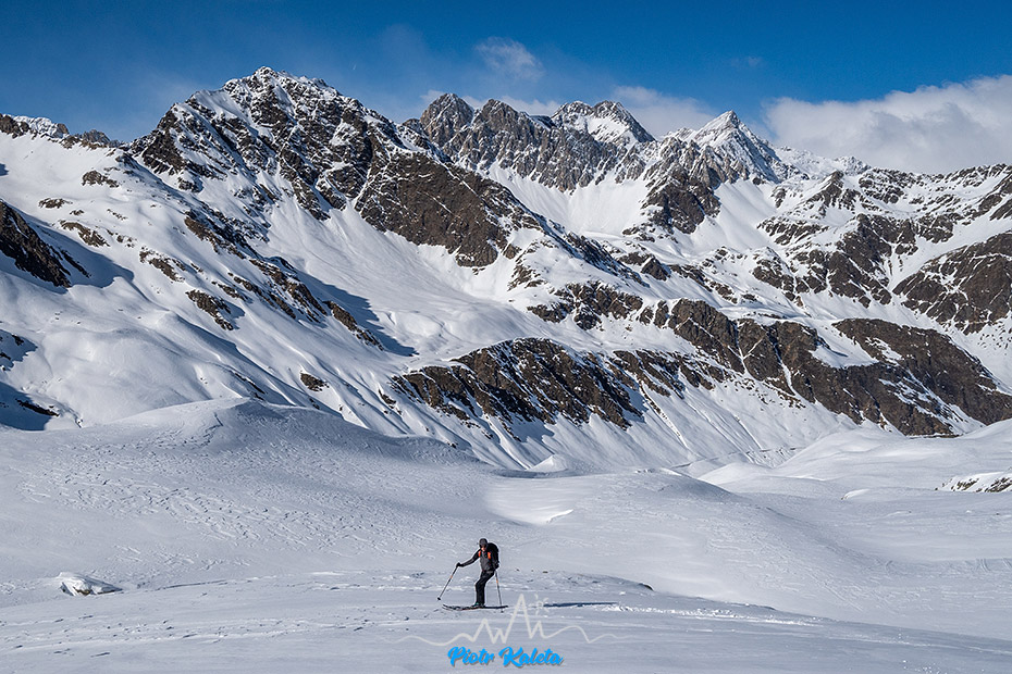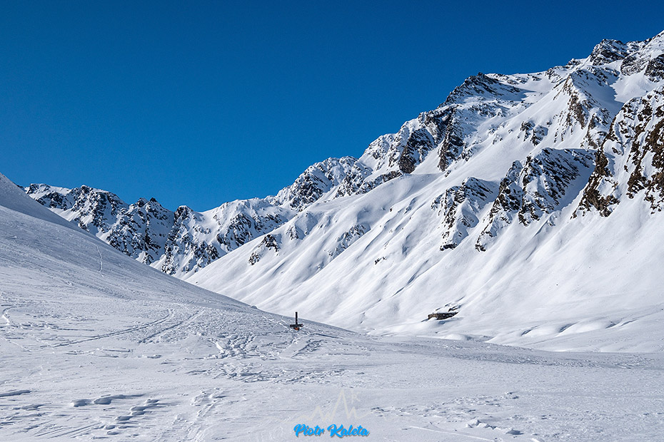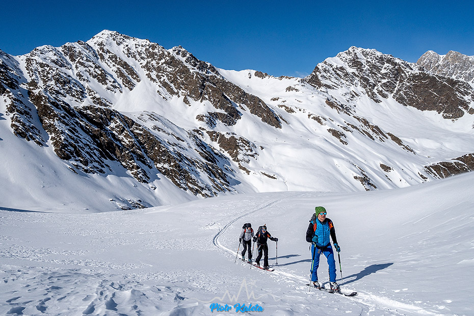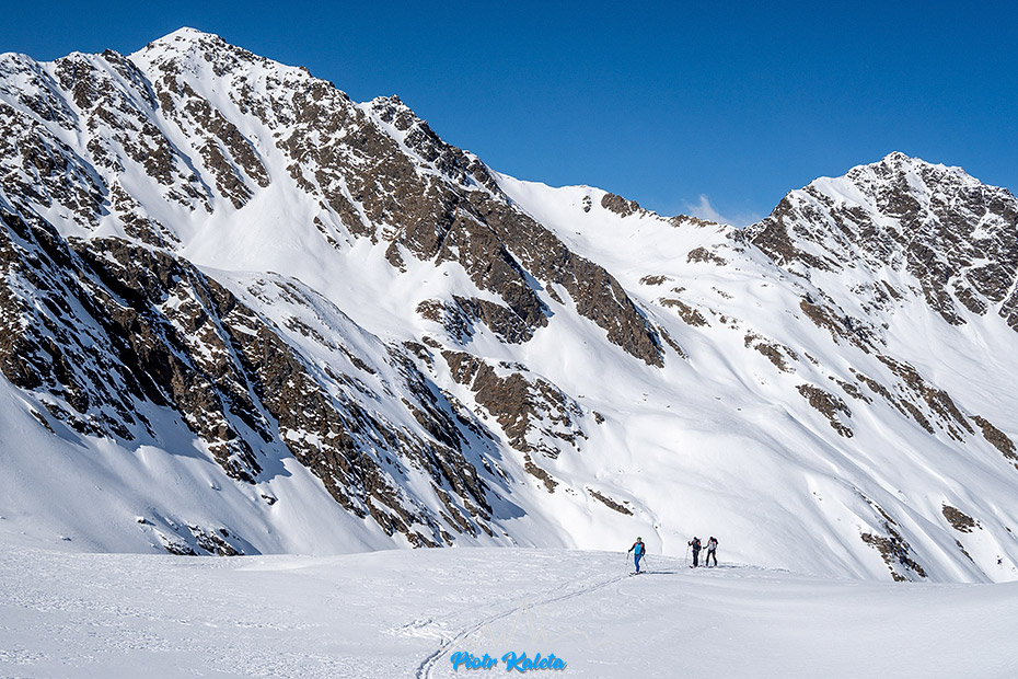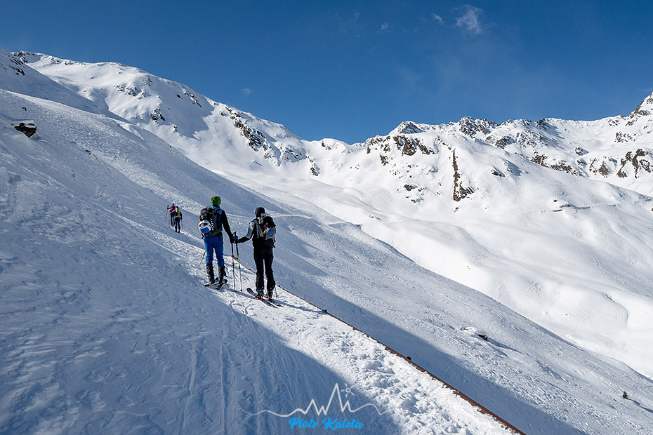 Lekkim trawersem idziemy prawie do końca doliny i tutaj – zdając się na nosa naszych poprzedników – kierujemy się zastanymi zakosami w stronę Sella di Racines (2480 m).