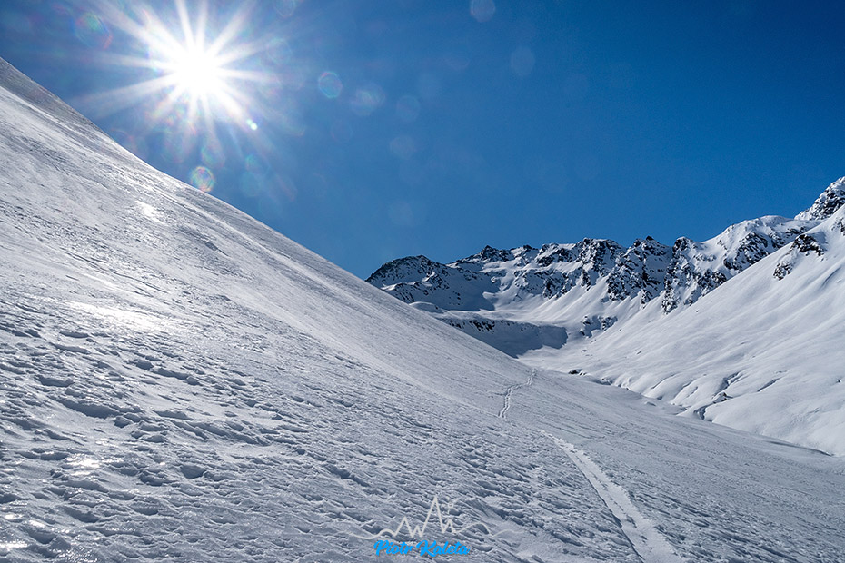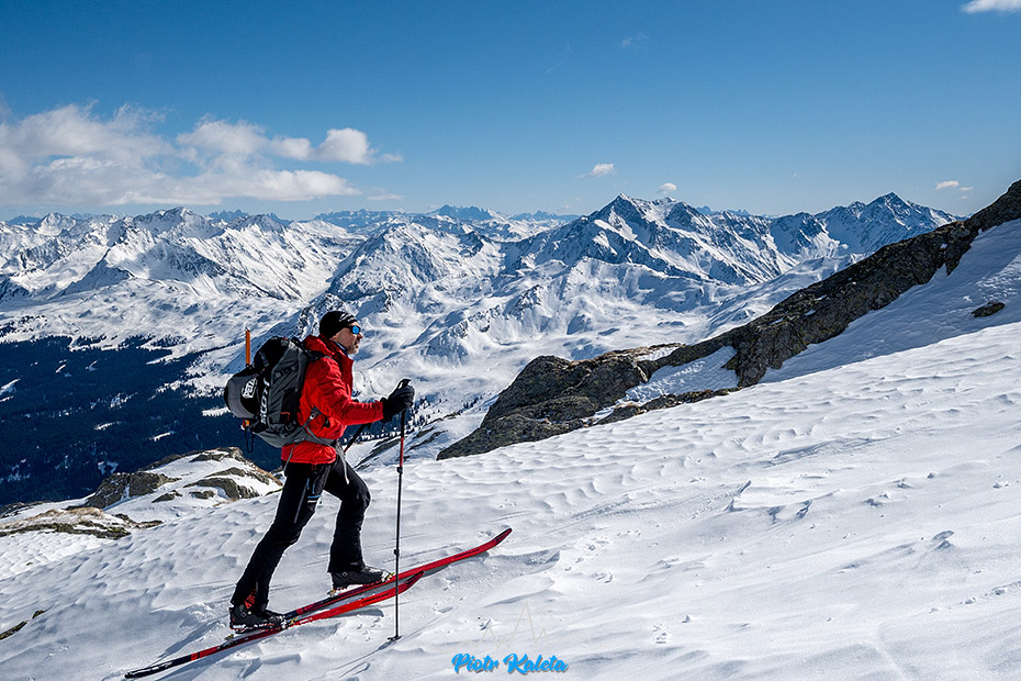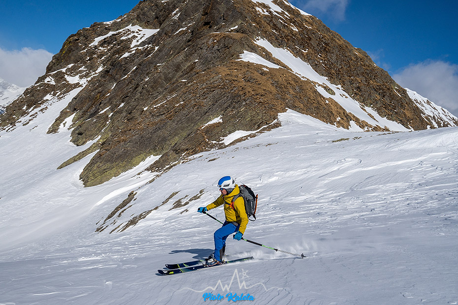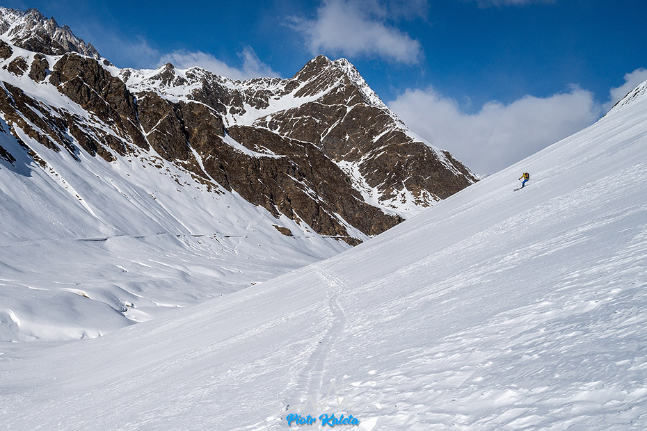 W takim otoczeniu w jakim się znajdujemy wysokość zdobywa się naprawdę przyjemnie. Natomiast sam śnieg cokolwiek rozczarowuje – ewidentnie od dłuższego czasu nie było tu nowych opadów i to co mamy pod fokami to trochę odpuszczona lodoszreń.