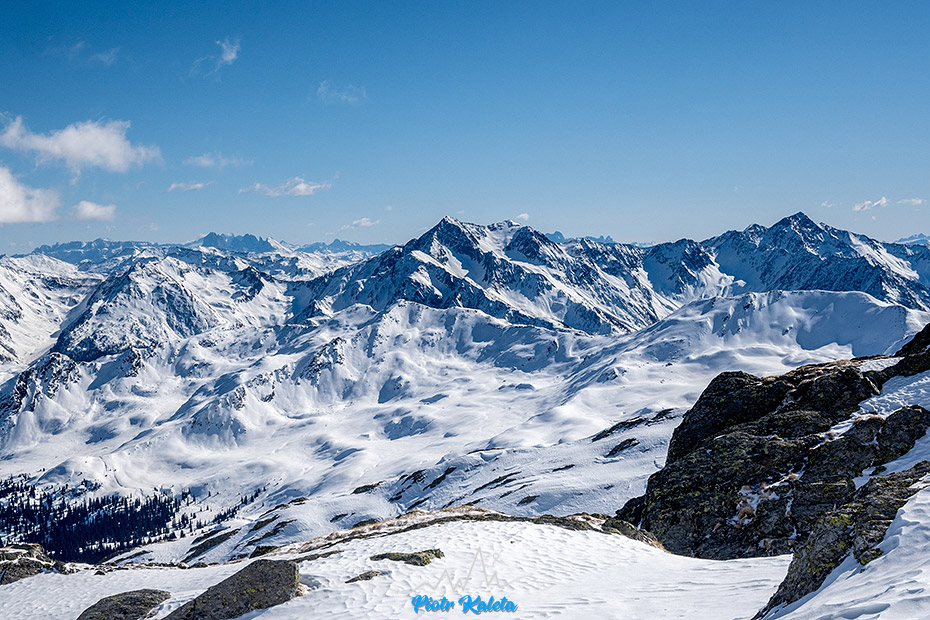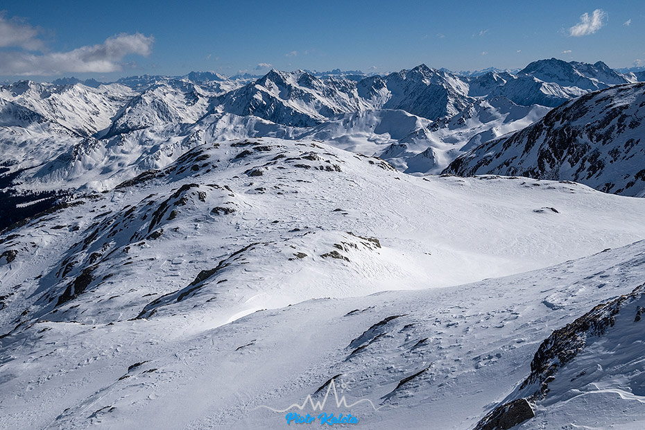 Teren jest nieco magiczny bo idzie się nie granią ale rozdzielającą doliny bardzo szeroką rynną. Do tego widoki do jakich tęskni chyba serce każdego kto kocha góry – morze szczytów na obie strony. Gdzieś tam w oddali na wschodzie dostrzegamy nawet Tre Cime di Lavaredo, a to przecież prawie 90 kilometrów od nas.