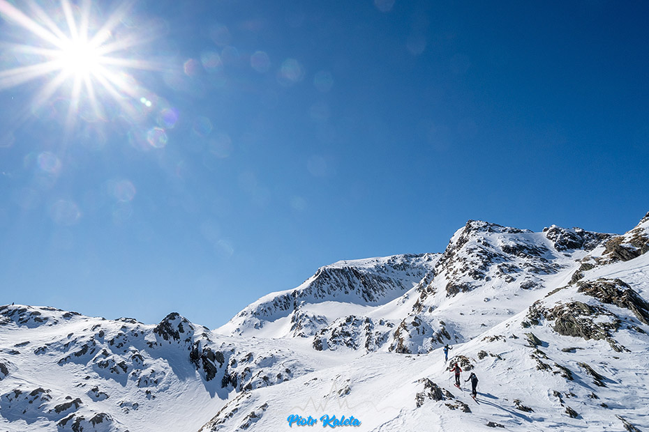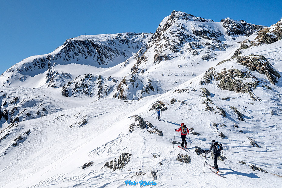 Do szczytu Bianki zostało może 3oom w linii prostej, natomiast ani topografia terenu przed nami ani warunki na zboczu (wciąż lekko odpuszczona lodoszreń) nie zachęcają nas do tego by znaleźć w sobie napinkę na szczyt.