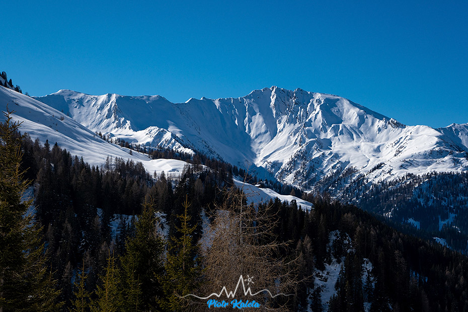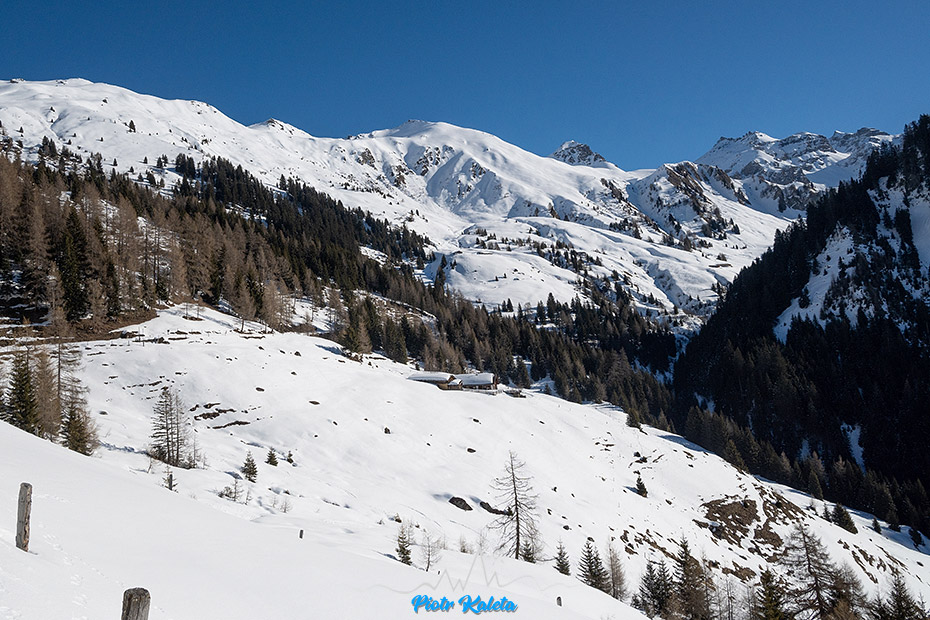 Na GPXie tura zaczyna się dopiero od Peeralm, czyli w sumie gospody otwartej cały rok. Dojście banalne, więc pominę. Za gospodą mijamy tablicę z informacją, że w pobliżu jest poligon etc. Chłopaki to w sumie olewają co dla mnie jest dziwne bo “nasz” dzisiejszy szczyt leży już na terenie poligonu. No OK. Nadal poruszamy się lokalną szutrową latem drogą a ślad poprzedników doprowadza nas do zabudowań na 175om. I tutaj zonk bo powinniśmy odbić w prawo w stronę samotnej chatki ale gdy przyglądamy się jej otoczeniu to za nic nie widać by ślady do niej prowadzące szły gdzieś wyżej. Krótka wymijania zdań i idziemy tak jak prowadzi ślad turowy.