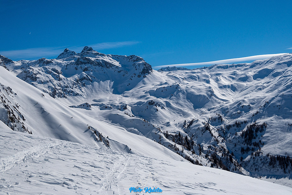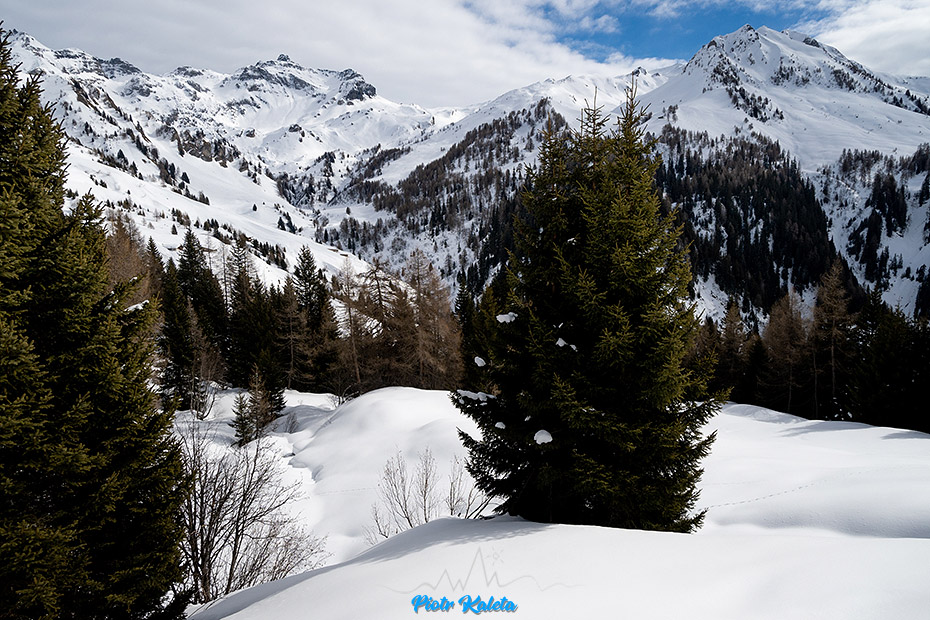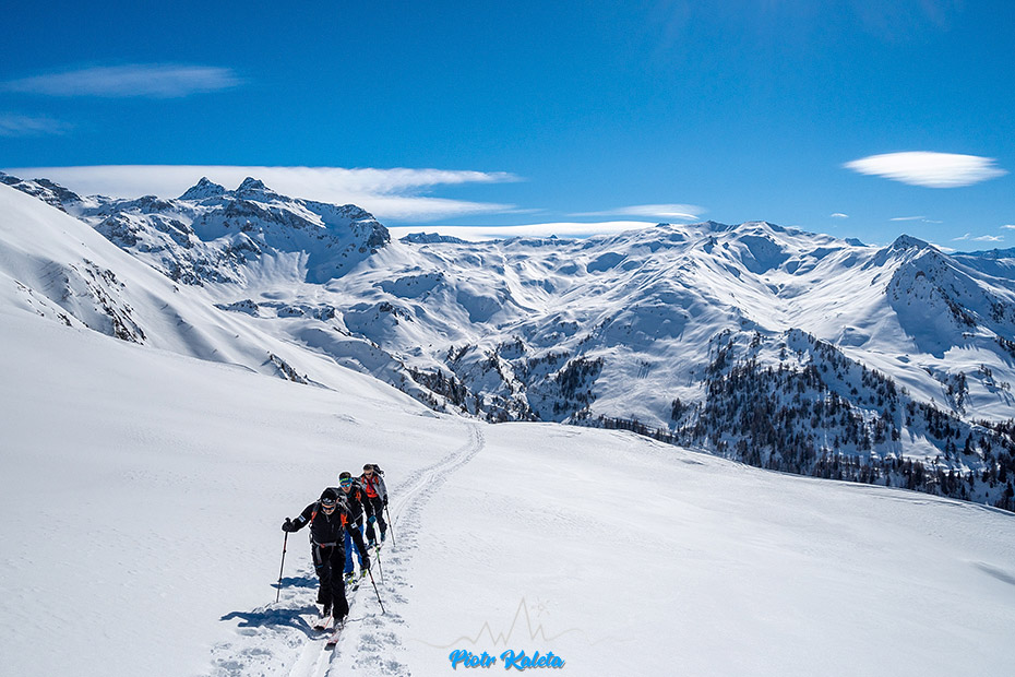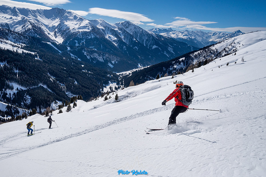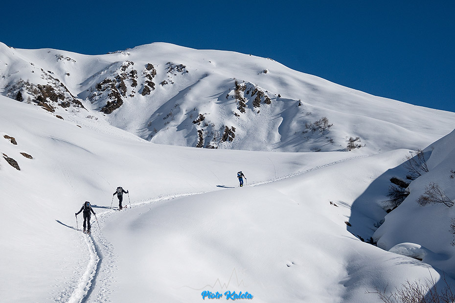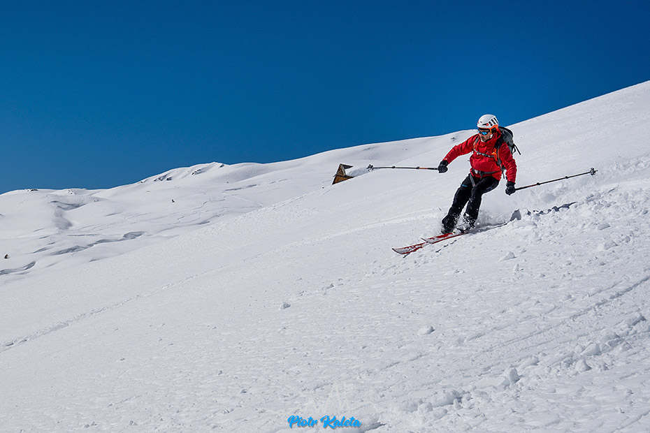 Ślad zdecydowanie odbija na zachód i sporymi zakosami wspina się w stronę grani. Będąc poprzednio z Myszką w tej dolinie nawet nie zdawałem sobie sprawy, że jej koniec kryje tak wspaniałe tereny do łażenia i zjazdów. Dziś wszystko jest dokumentnie zryte, ale co trzeba to zostanie w pamięci na kolejny raz.