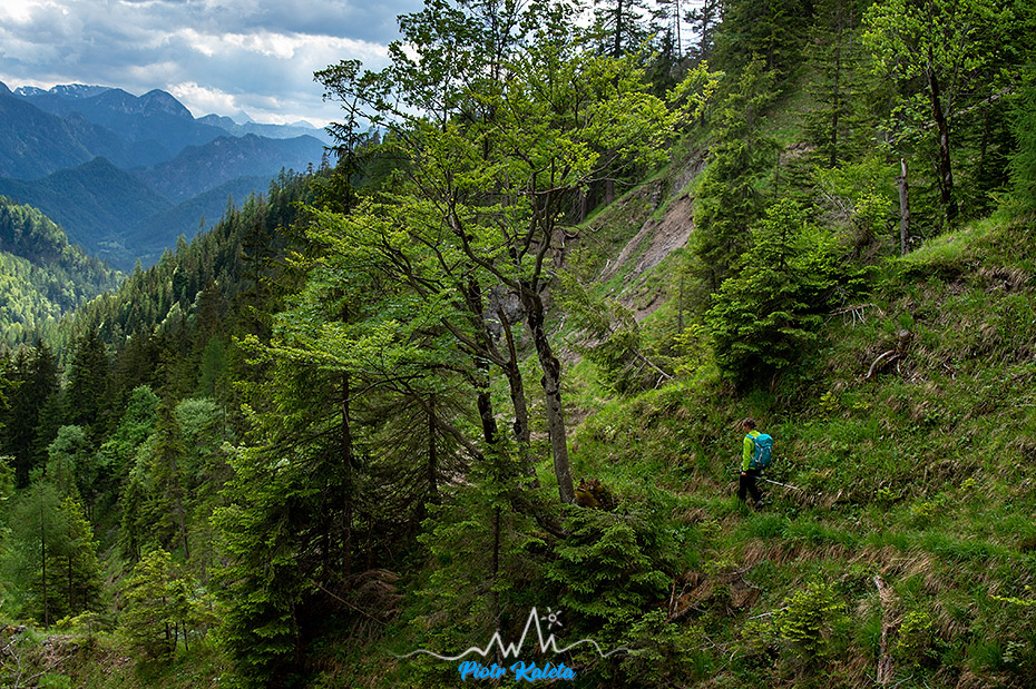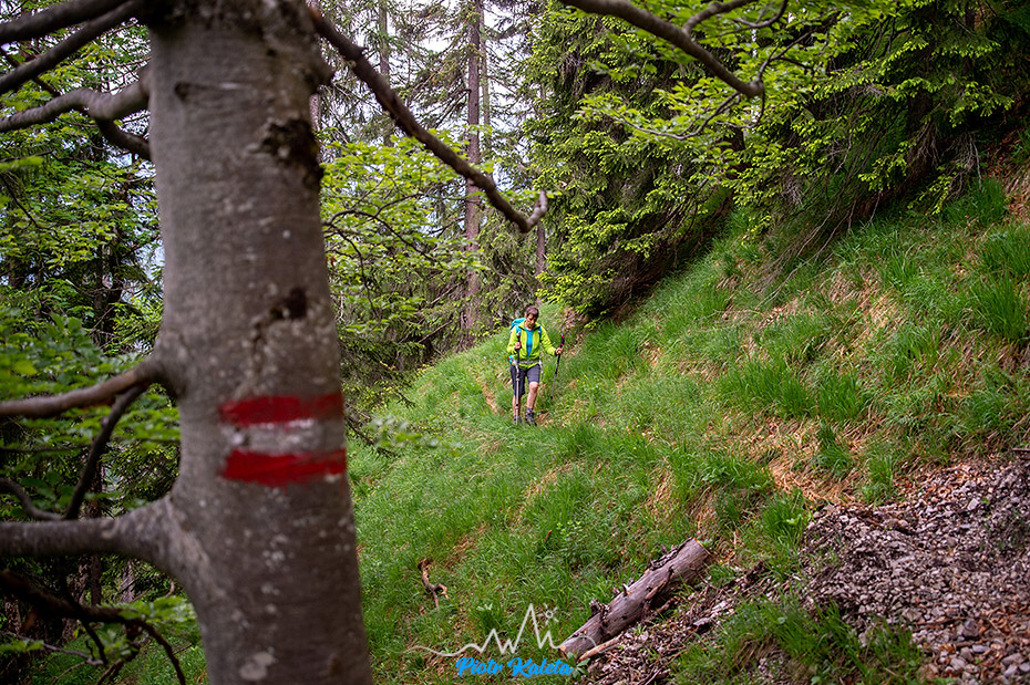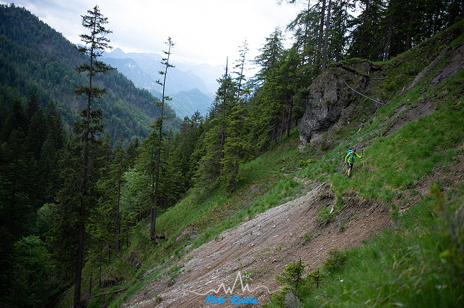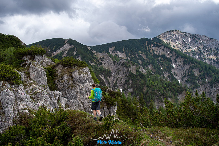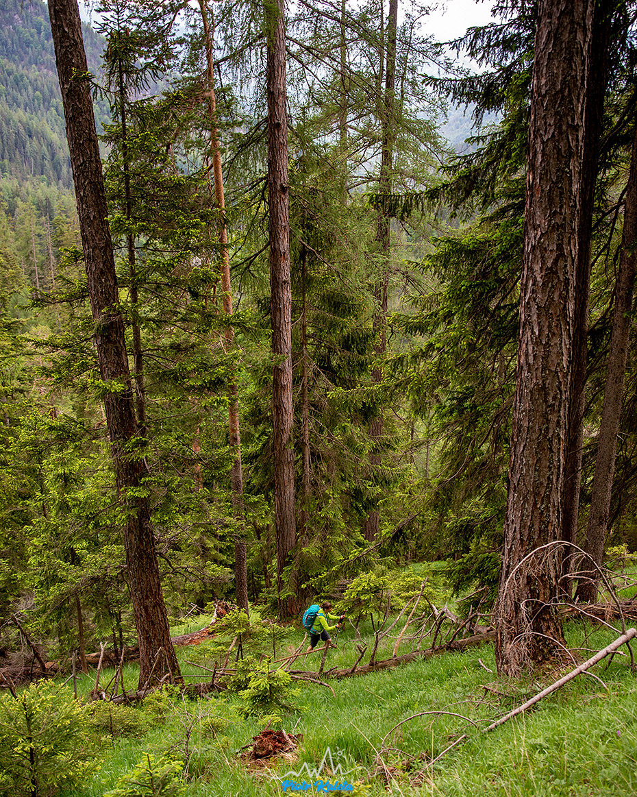 Tak się złożyło, że nad naszym kampingiem górowała dość symetryczna piramida Kleiner Hochstadl (1835 m), a w Traficzce mieliśmy spakowane treki, kijki i plecaki. No to wio: o 11:00 kamping znika już gdzieś w lesie. Na dwójkę turystów trafiam tylko w okolicy przełączki będącej najniższym łącznikiem między naszą a doliną którą chcieliśmy dalej podchodzić. Przez resztę dnia nie spotkamy już nikogo.