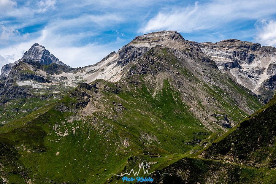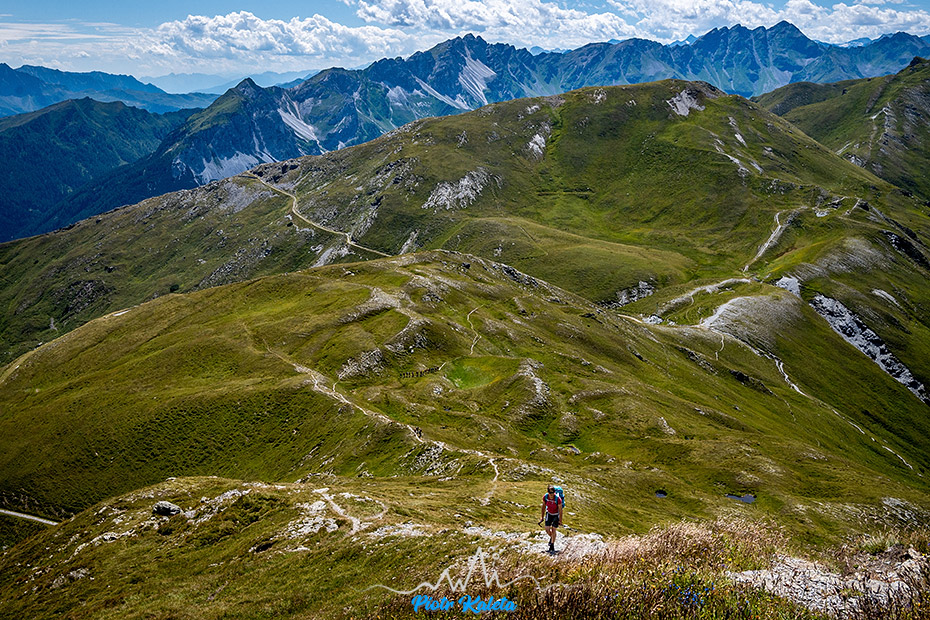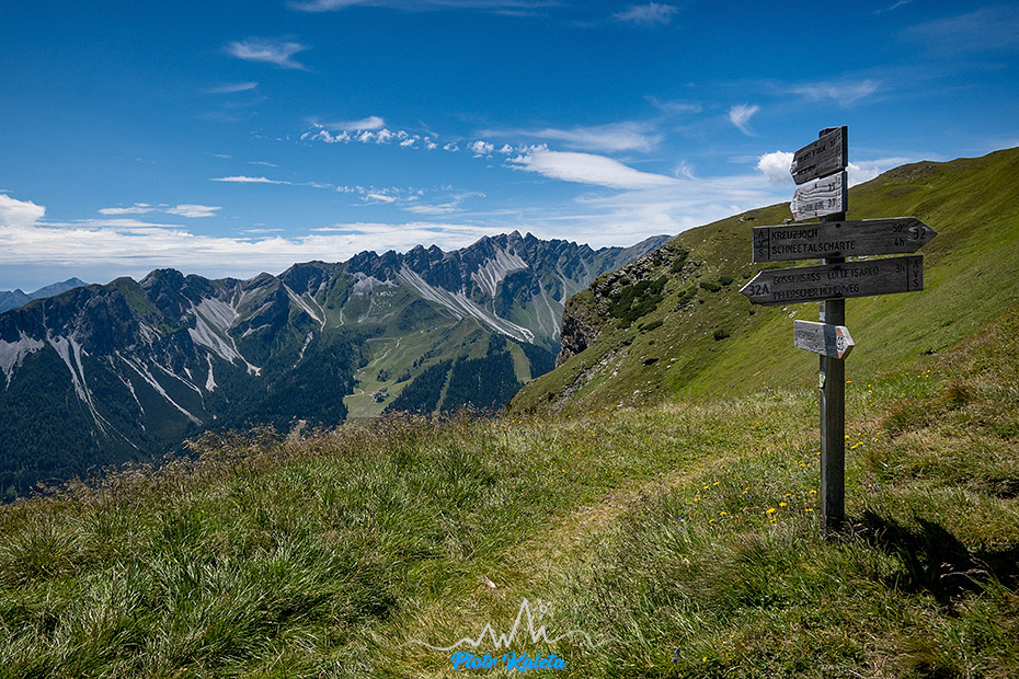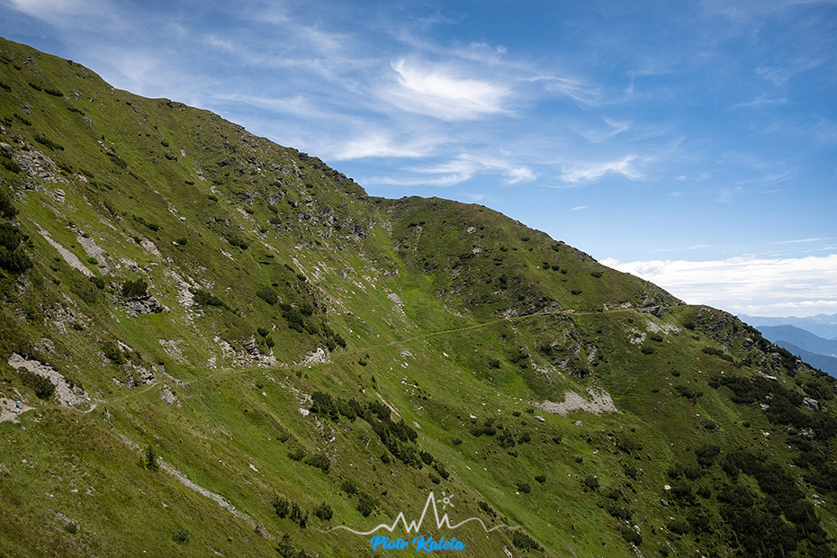 Podejście na Hoher Lorenzenberg / Monte San Lorenzo. O ile do tej pory było pusto, to tutaj mijamy grupę 2o osób. Średnia zachowana. A na szczycie trafiamy jeszcze na kilku bajkerów – jeden załapał się na zdjęcie startowe : D