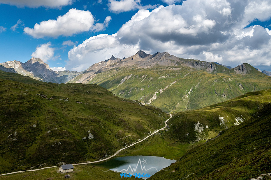 Klammljoch widziany z podejścia na Barenluegscharte. Są bunkry jest więc i dobra droga. My wracamy do widocznej na dole chatki i przy niej odbijamy w górę.