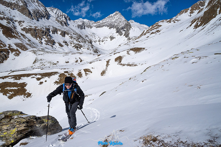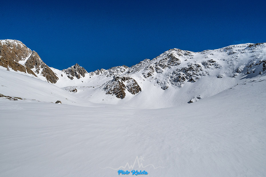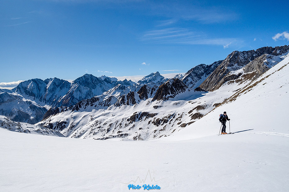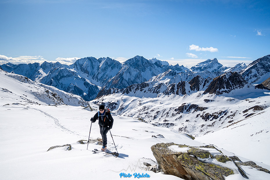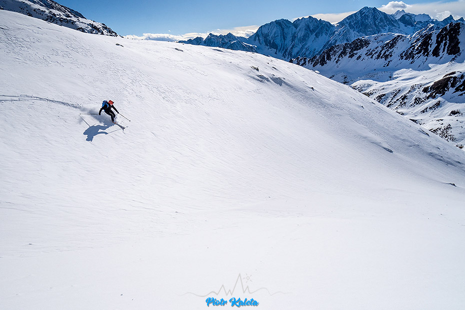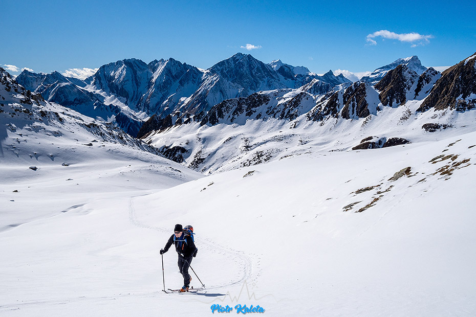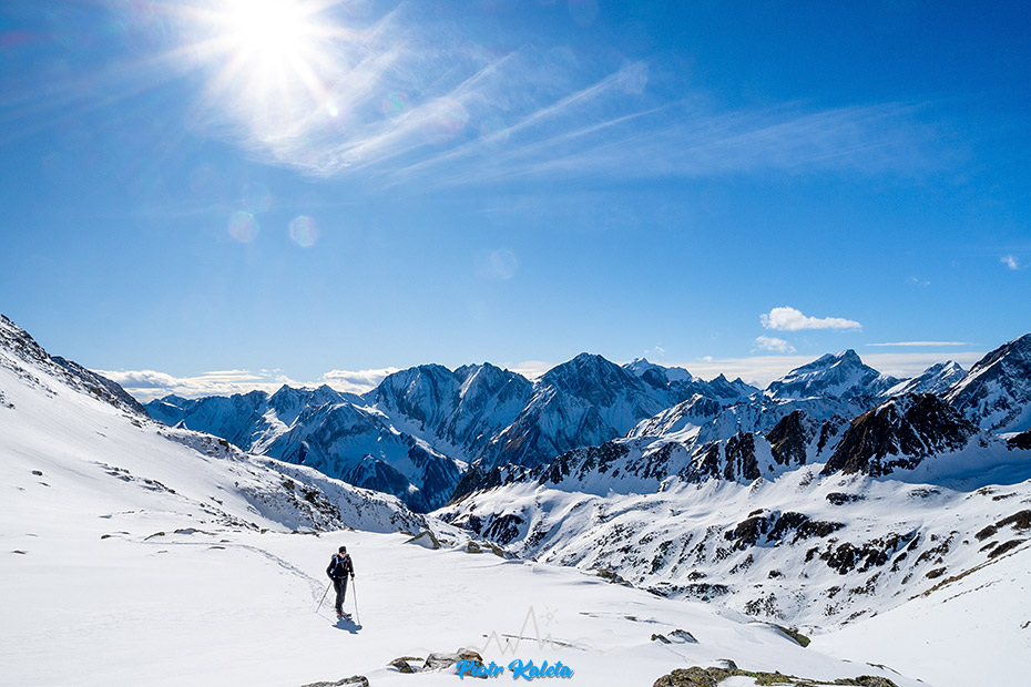 Śnieg jest i jest jego ciągłość w górę, więc nart nie trzeba będzie odpinać. Na drugim planie Rote Riffl (2874 m) – chyba 😉