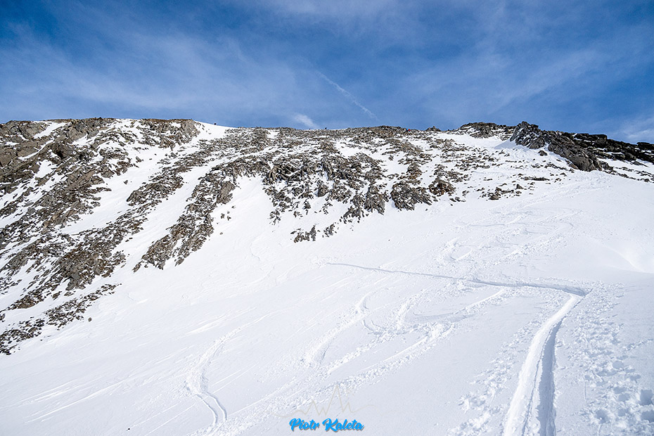 Na grań wyprowadza śnieżna rynna, my kończymy u jej podstawy.