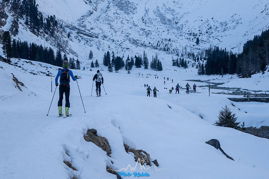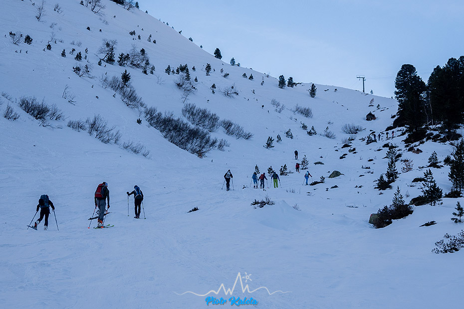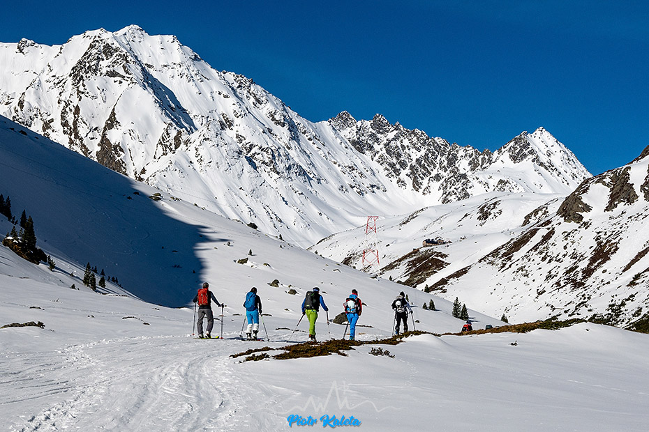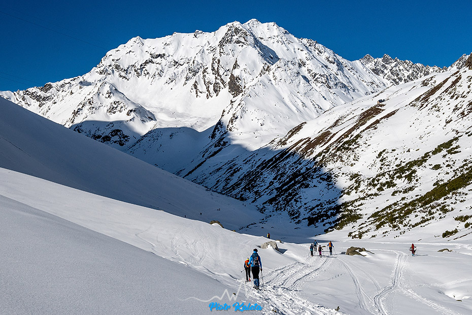 Szczęśliwie część tego tłumu poszła prosto, my odbijamy w boczną dolinkę. Plan A to Winnebachjoch (2782m) a jak czas pozwoli to może coś więcej. Na razie marzymy o słońcu bo przy aucie było -8°C i jakoś dreptanie dziś nie rozgrzewa : (