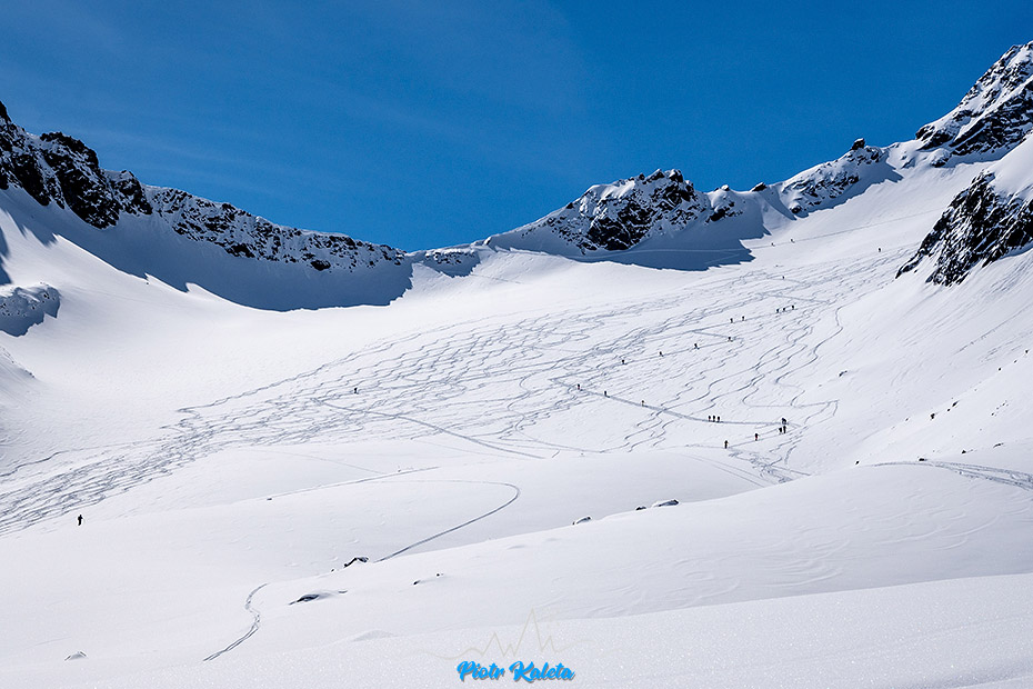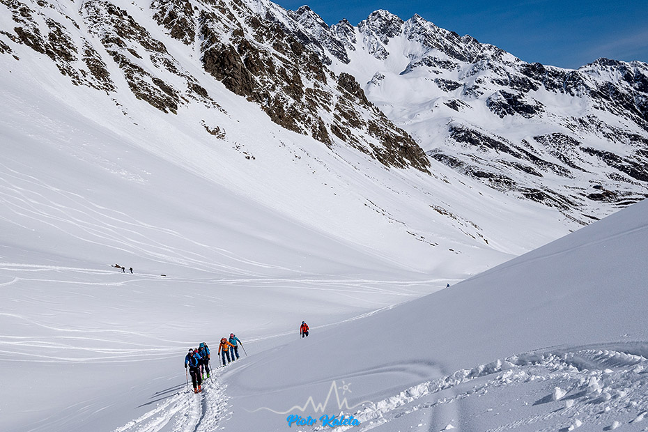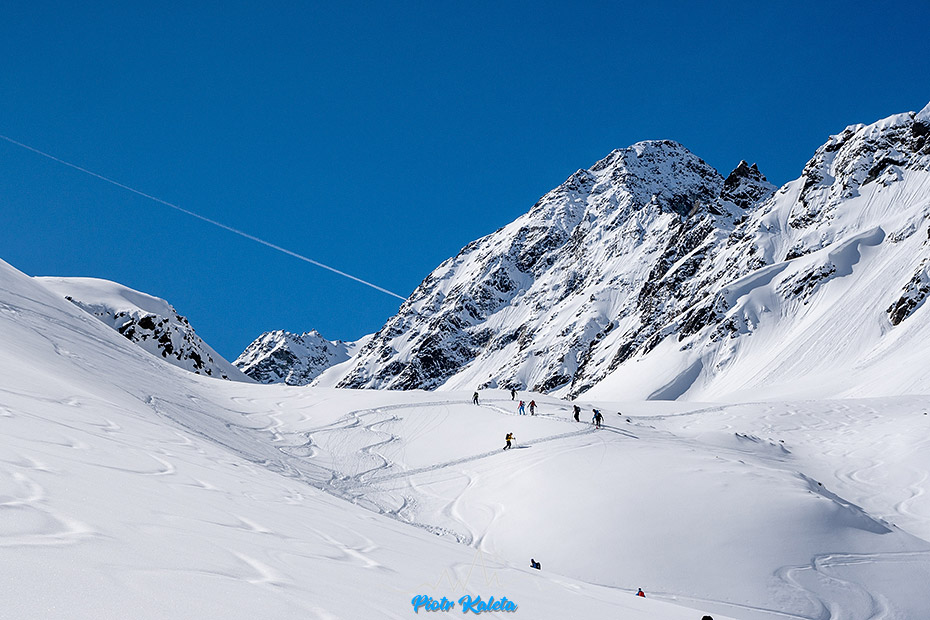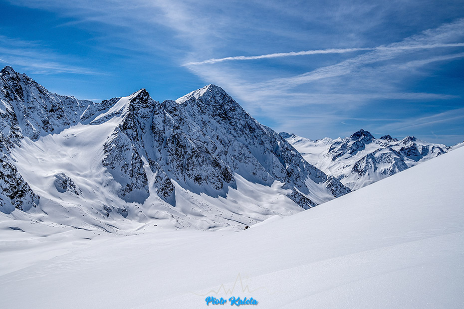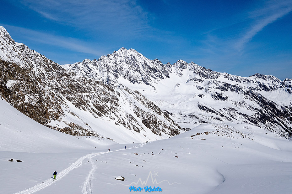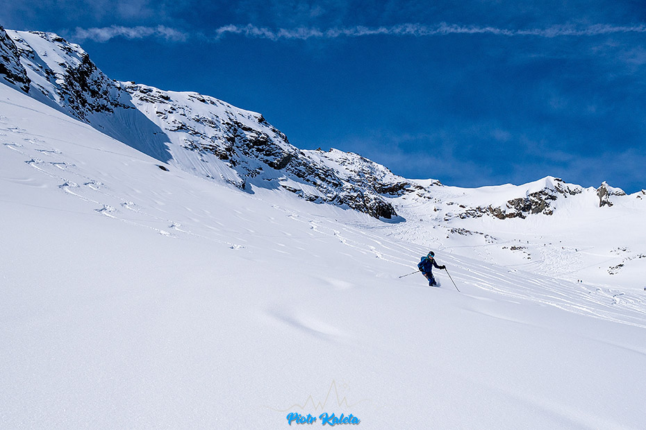 Środowisko zdecydowanie obfituje w cele. Przez to, że nie możemy zdecydować się gdzie iść … się rozdzielamy. Piotrka ciągnie pięknie wyśnieżone zbocze po prawej, mnie przełączka gdzieś w głębi doliny. Przełączka czyli … Längentaljoch : )