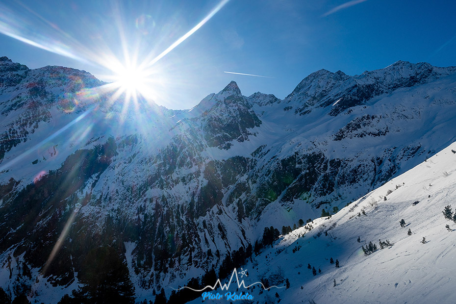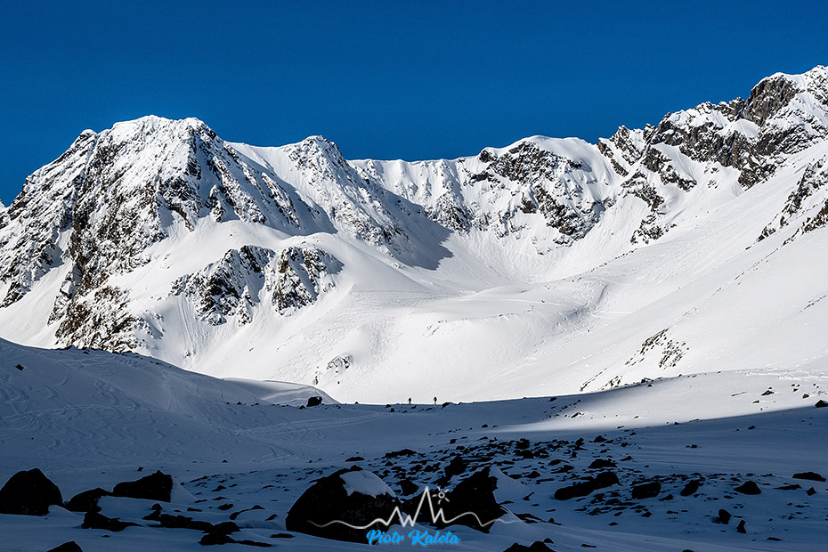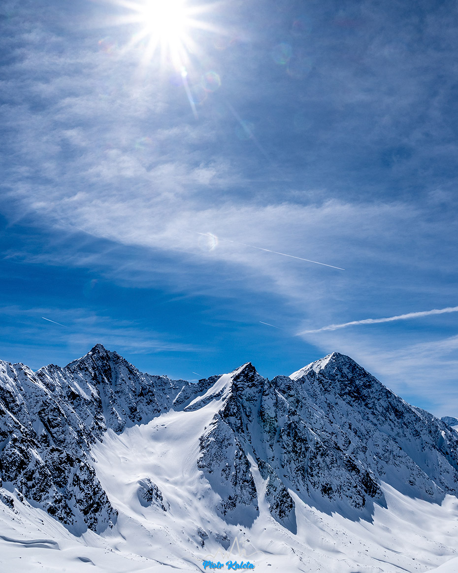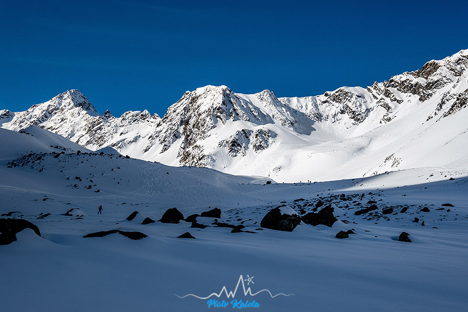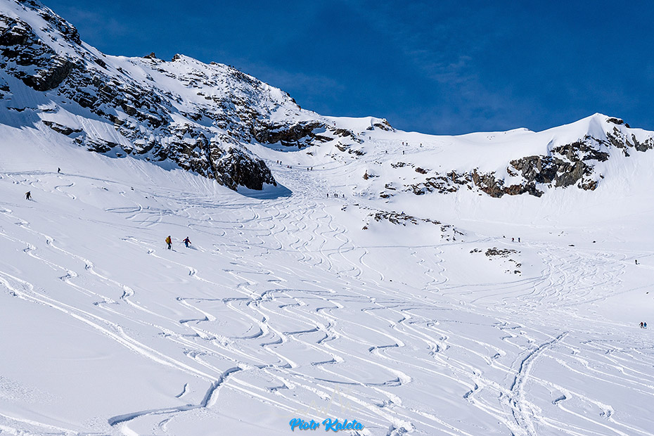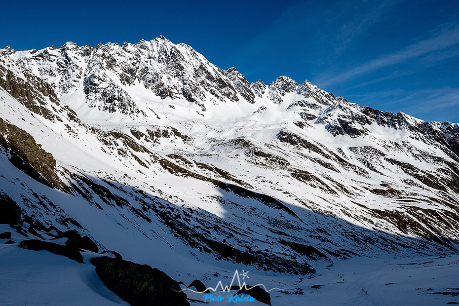 Środowisko zdecydowanie obfituje w cele. Przez to, że nie możemy zdecydować się gdzie iść … się rozdzielamy. Piotrka ciągnie pięknie wyśnieżone zbocze po prawej, mnie przełączka gdzieś w głębi doliny. Przełączka czyli … Längentaljoch : )