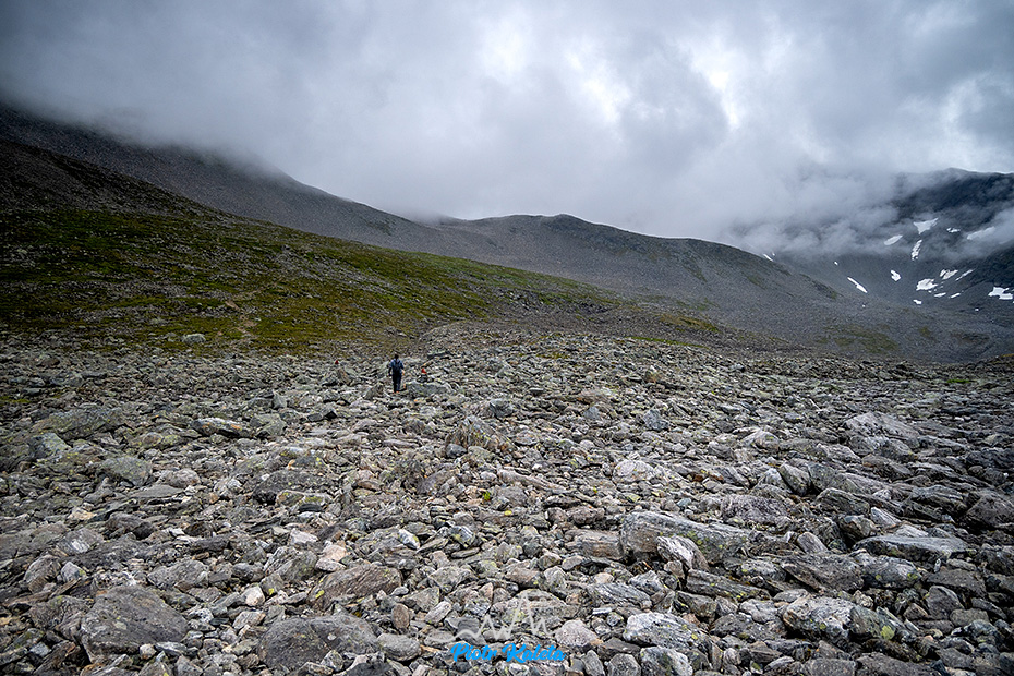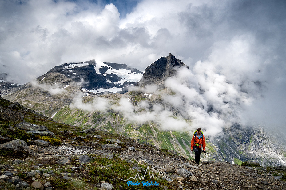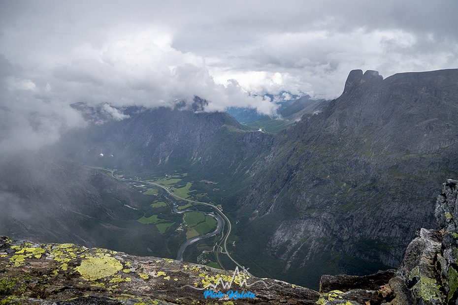 Romsdalen w bardzo niepełnej okazałości “bikos” oczywiście chmury. Wiem – powtarzam się. Swoją drogą to takie płaskie po prawej ze szczerbinką to Romsdalshornet (1550m). Ścieżka jest 😉