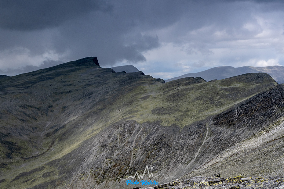 Ostatni istotny garb na grani Bråkdalsbelgen – przed nami 2oom w pionie i 8oo w linii prostej. Ale przez to stalowe niebo nad szczytem nie ryzykujemy pchania się w opad. Wycof. Pada zaczyna dosłownie po kilki minutach od podjęcia decyzji o zejściu.