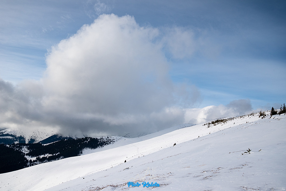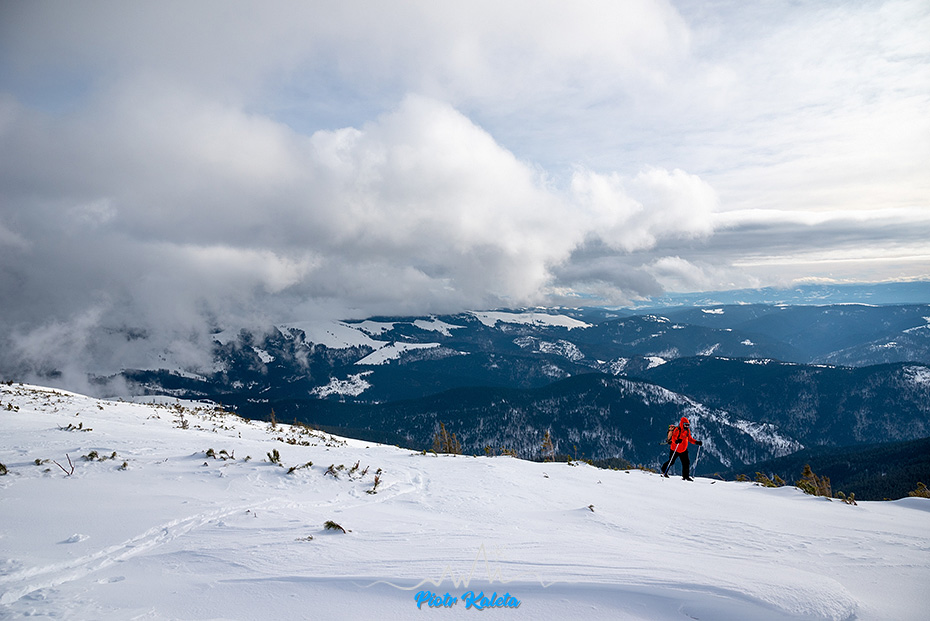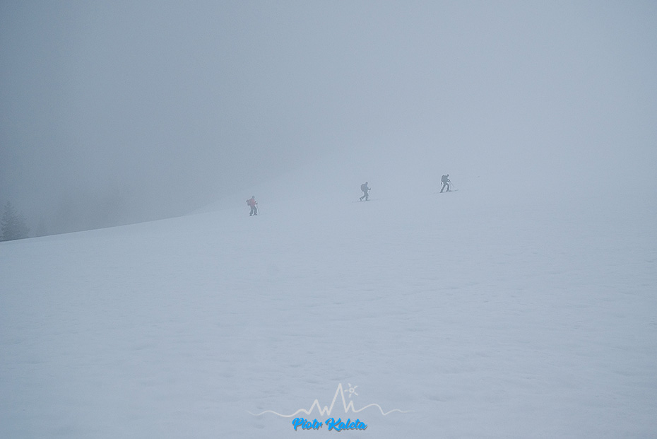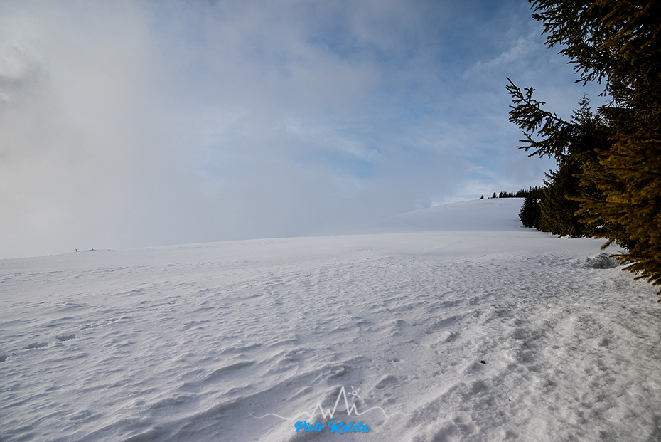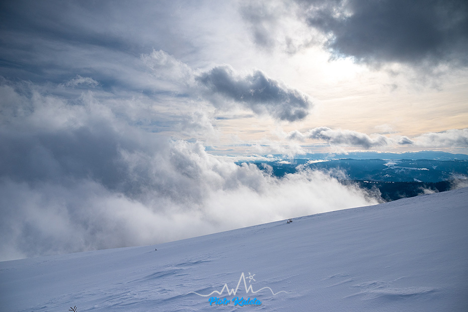 Kolejne przejaśnienia tuż poniżej szczytu. Wieje tak, że narty i kijki kładę w wydeptanym wgłębieniu w śniegu by ich nie zwiało.