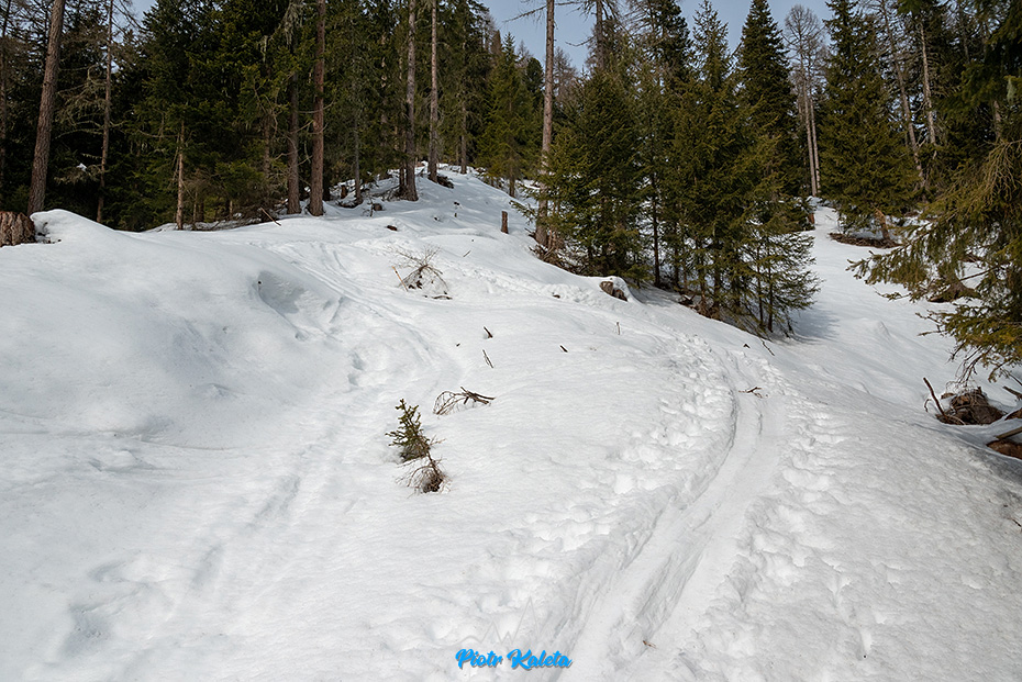 Początek jest taki sobie, strome zakosy żlebem i trawers do lasu.