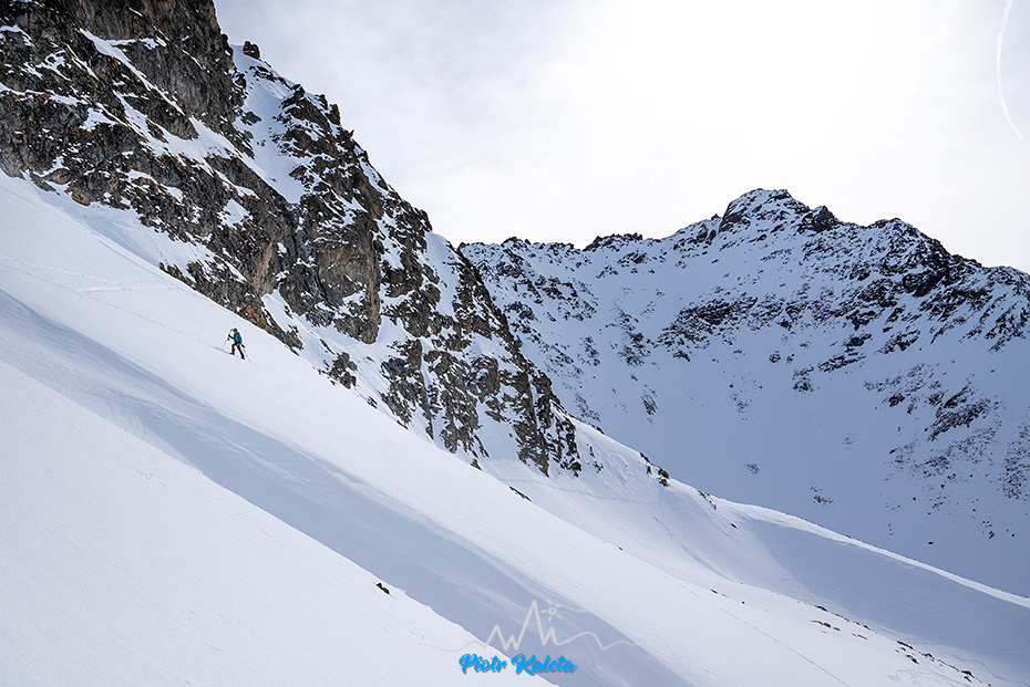 Marian na szybkiej akcji na lekko na przełęcz poniżej Wiesjagglkopf.
