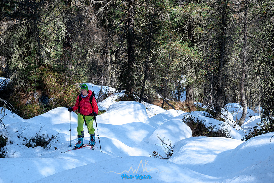Gdy ruszamy proponuję ścięcie drogi do czegoś co chyba było kiedyś nartostradą. Idziemy lasem i terenem, który jest bardzo pofałdowany. Kluczymy sobie spokojnie miedzy drzewami i przysypanymi śniegiem głazami ciesząc się z dnia i sukcesywnie zdobywając wysokość.