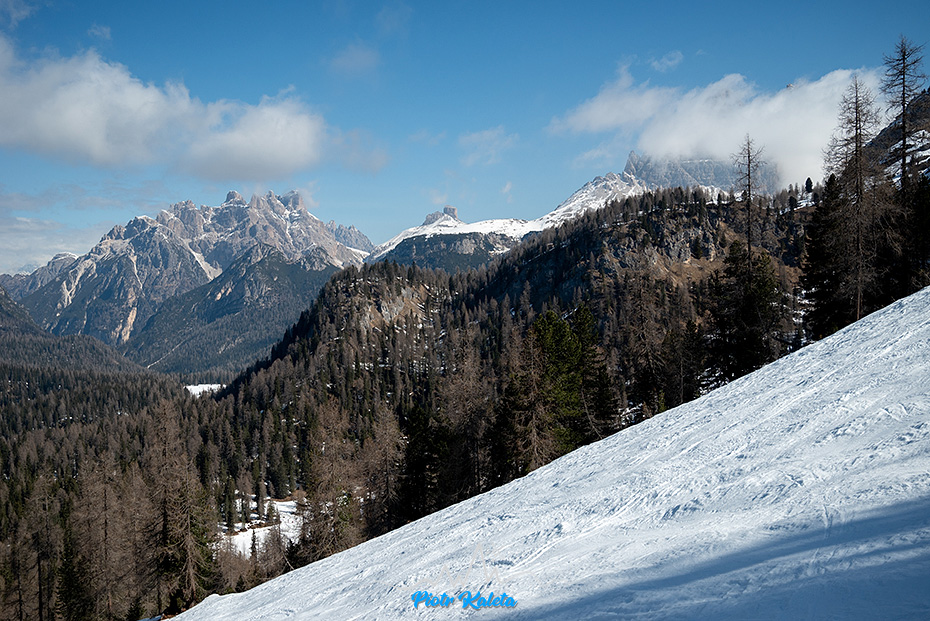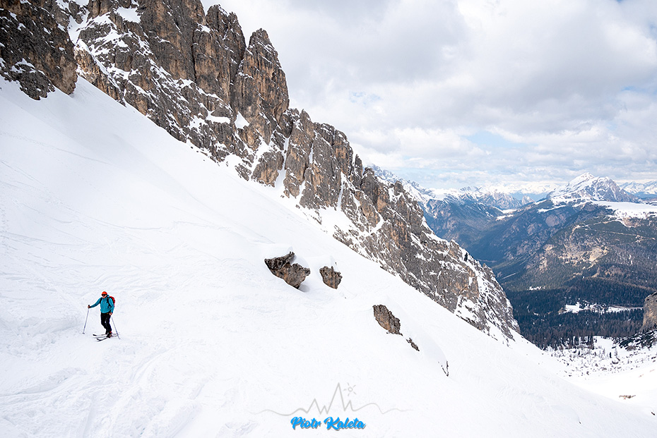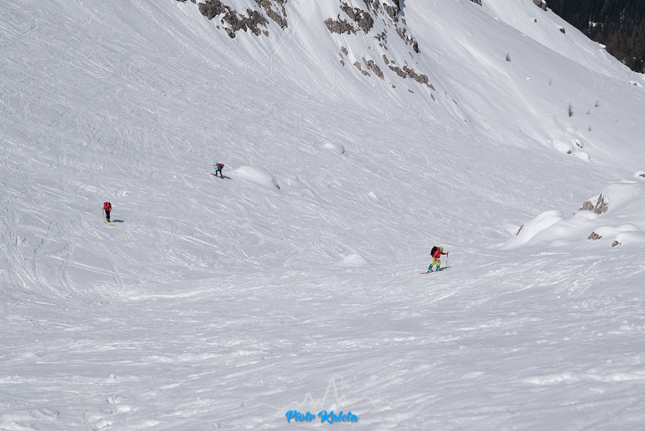 Parking, ładny poranek, ładne widoki. Gdzieś tam poniżej przełęczy po lewej można wypatrzyć Rifugio Fonda-Savio. Idziemy. Gdy dochodzimy do polany za którą teren się pionizuje już wiem, że z planów nici: fragment stoku przed progiem jest w cholerę stromy. Dla Myszki może i do wejścia w harszlach, ale raczej nie do zjazdu 🙁 Teraz rozumiem dlaczego ono ma wycenę ZS+. Naturalną alternatywą jest sąsiednia dolina i kończąca ją Forcella della Neve.