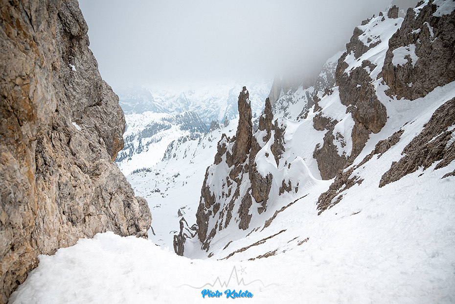 Teren do samej przełączki jest wyślizgany od nart ale na szczęście śnieg jest na tyle miękki i śladów po poprzednikach jest tak dużo, że raki nie są potrzebne. Po trzech czy czterech zakosach jestem na siodełku. Po swojej prawej widzę podchodzącego Roberta, po lewej nic nie widzę tyle jest chmur.