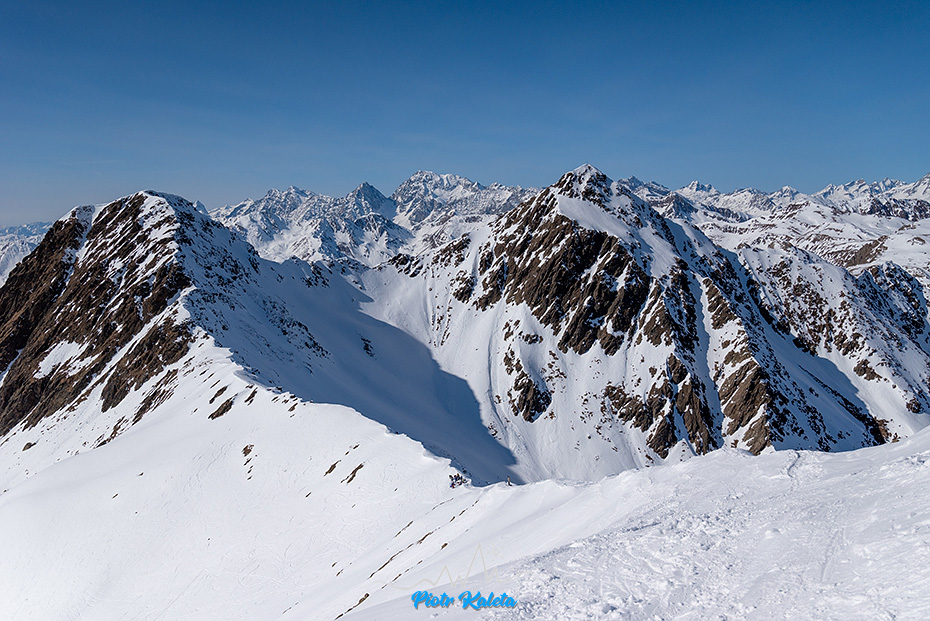Kilka osób próbuje szczęścia na pierwszym dużym żlebie licząc od szczytu Rotlahner’a – nic nie wyjeżdża.