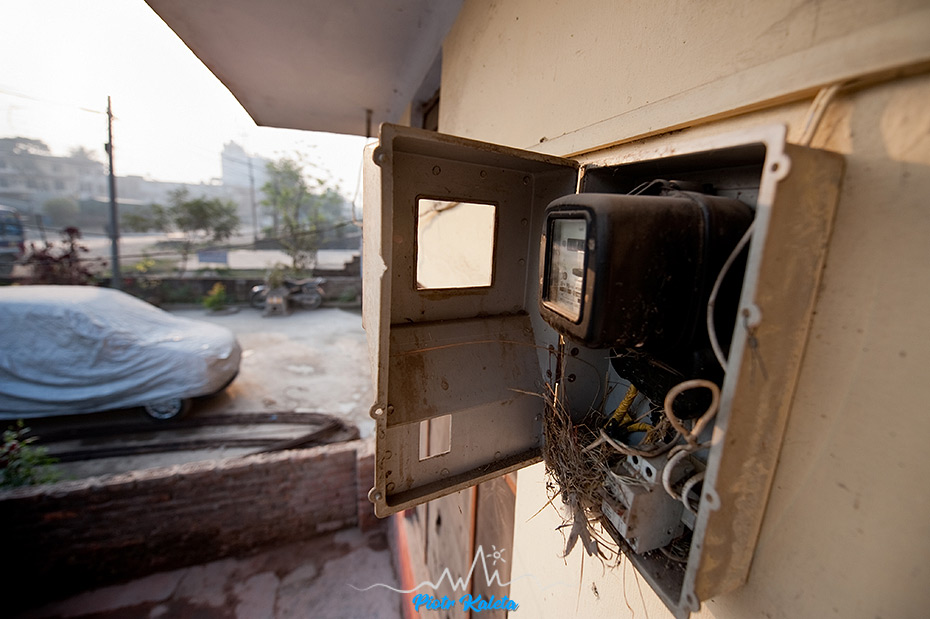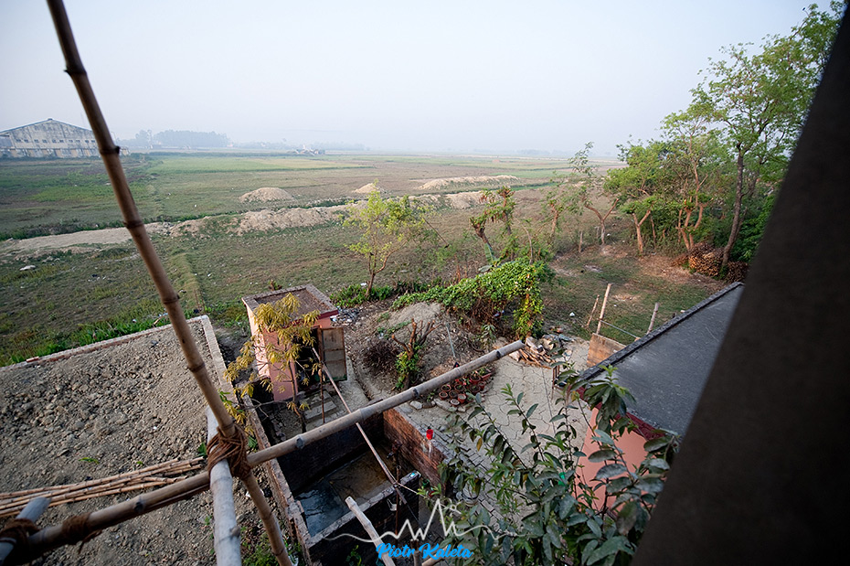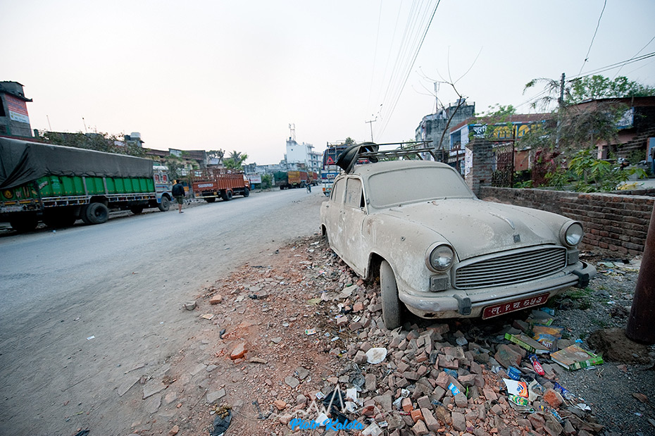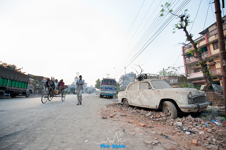 W cenie biletu autobusowego był nocleg w hotelu przy granicy. Rano koło 9.00 mieliśmy ruszyć w drogę do Katmandu, więc żeby nadrobić zaległości poznawcze z nocy rano robimy szybki spacer po najbliższej okolicy. Przed hotelem wita nas taki fotogeniczny wrak.