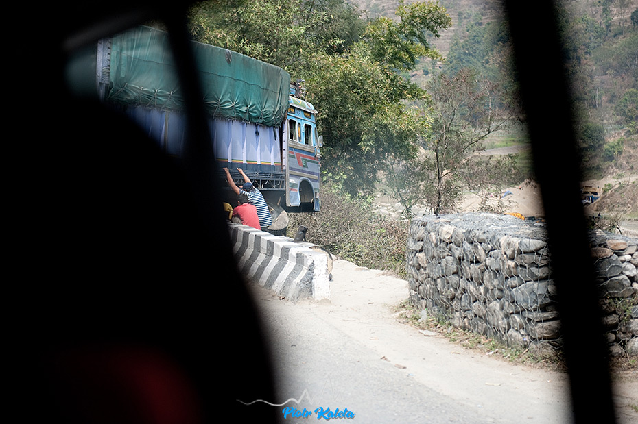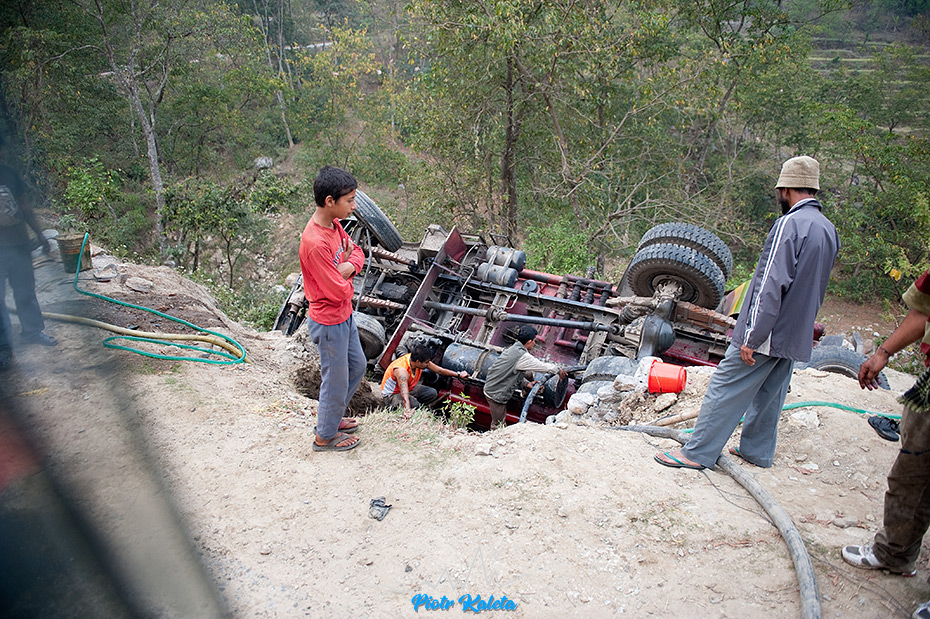 Pojęcia nie mam, czy każdy kto po raz pierwszy widzi serpentyny jakimi jest poprowadzona droga do doliny Katmandu zastanawia się czy dochodzi tu do wypadków – w każdym razie my się zastanawialiśmy. Jak się okazało – dochodzi, powyżej widać jeden z dwóch przypadków jakie się nam tego dnia po drodze trafiły.