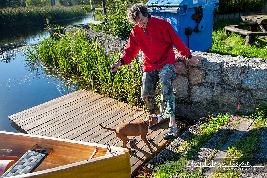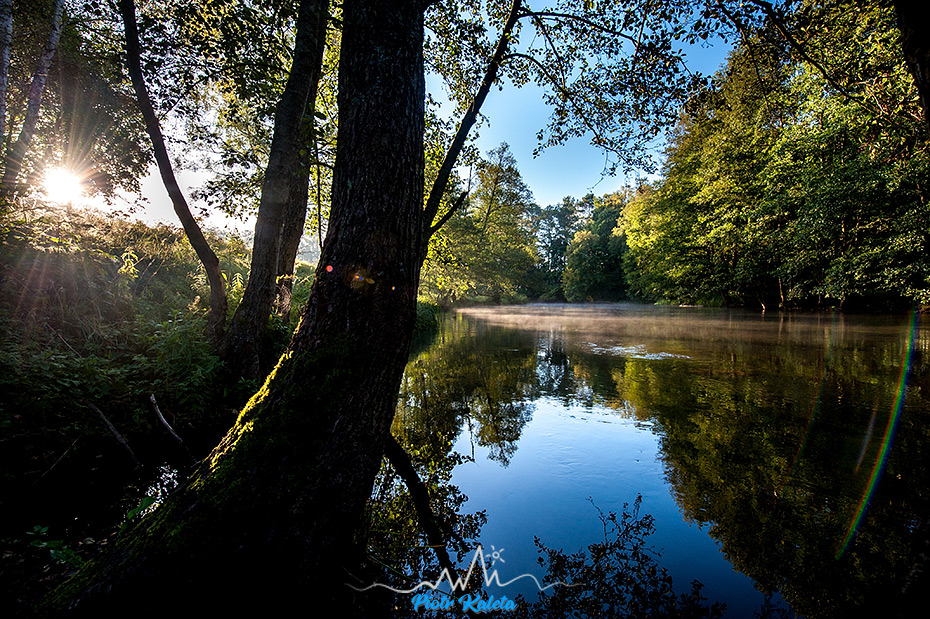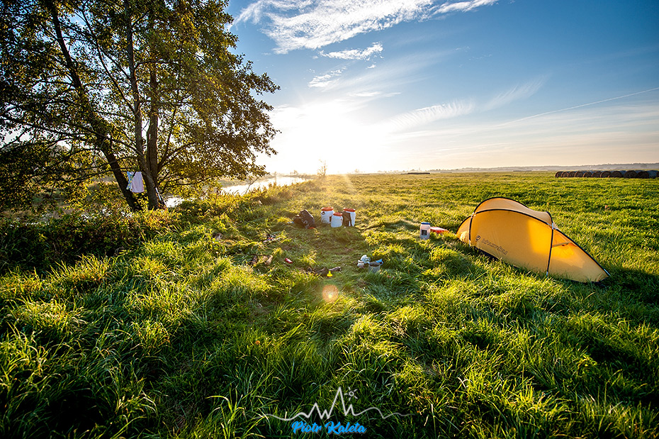 Tym razem pobudki nikt nam nie organizuje, niemniej nieco po 7.oo siedzę na brzegu z aparatem w ręce i próbuję jakoś ciekawie złapać poranne mgły i słońce świecące z kontry. Namiot po tej nocy jest zupełnie wilgotny, więc przede wszystkim czekamy na to by na drugim końcu pola namiotowego pojawiło się słońce. Gdy tylko tak się staje przenosimy tam namiot. Rozpalone ponownie ognisko przyjemnie towarzyszy śniadaniu i pakowaniu sprawiając przy okazji, że wszystkie te czynności przeciągamy ile tylko można : ) Na koniec namiot przenosimy do podsuszenia na drugi koniec łąki – tam gdzie operuje już słońce. Naukę z tego suszenia mamy taką, że trzeba go w tym czasie przestawiać, by słońce ogrzewało go z różnych stron.