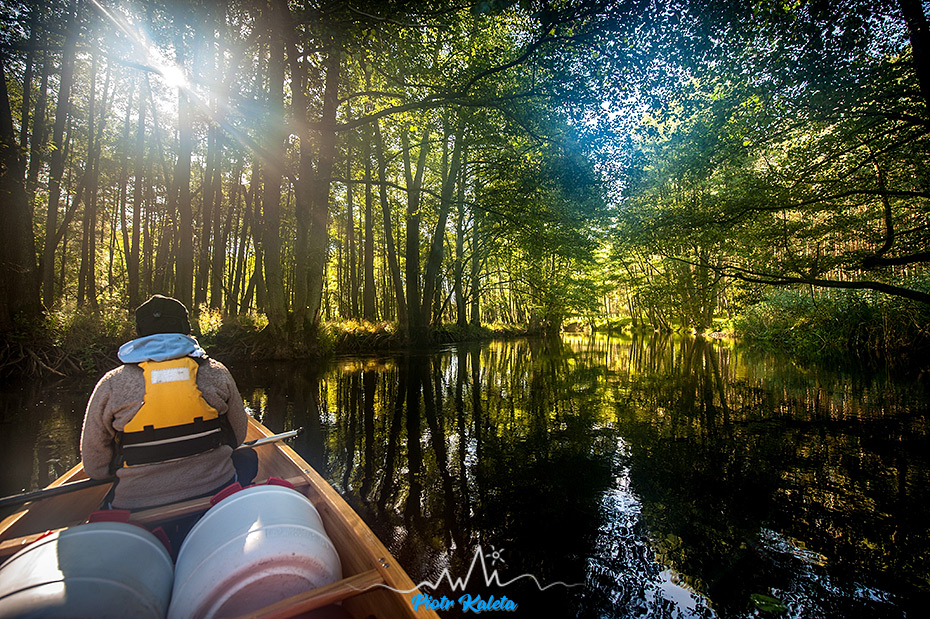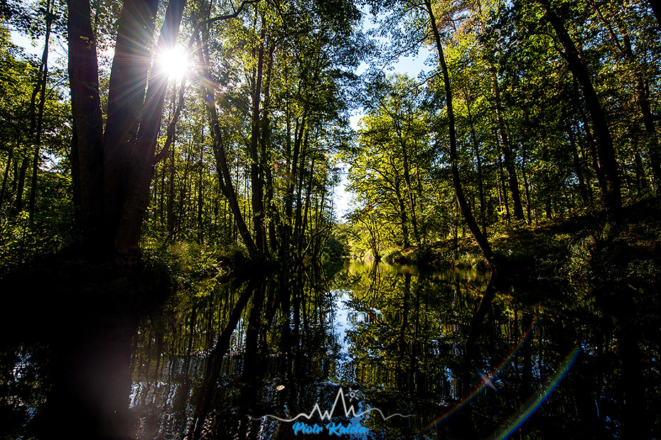 Wg mapy od pola do końca parku są niecałe trzy kilometry a my dopływając do miejsca gdzie Płociczna wpada do Drawy nie bardzo możemy uwierzyć, że jeszcze pół godziny wcześniej pakowaliśmy kanu. Bo to oznacza, że wiosłujemy w tempie 6km/h! : ) Przez Stare Osieczno przemykamy bez postoju, zwalniamy dopiero w okolicy leśniczówki Kotlina ale tylko po to by złapać słońce fajnie prześwitujące przez korony drzew i od razu kontynuujemy wiosłowanie.