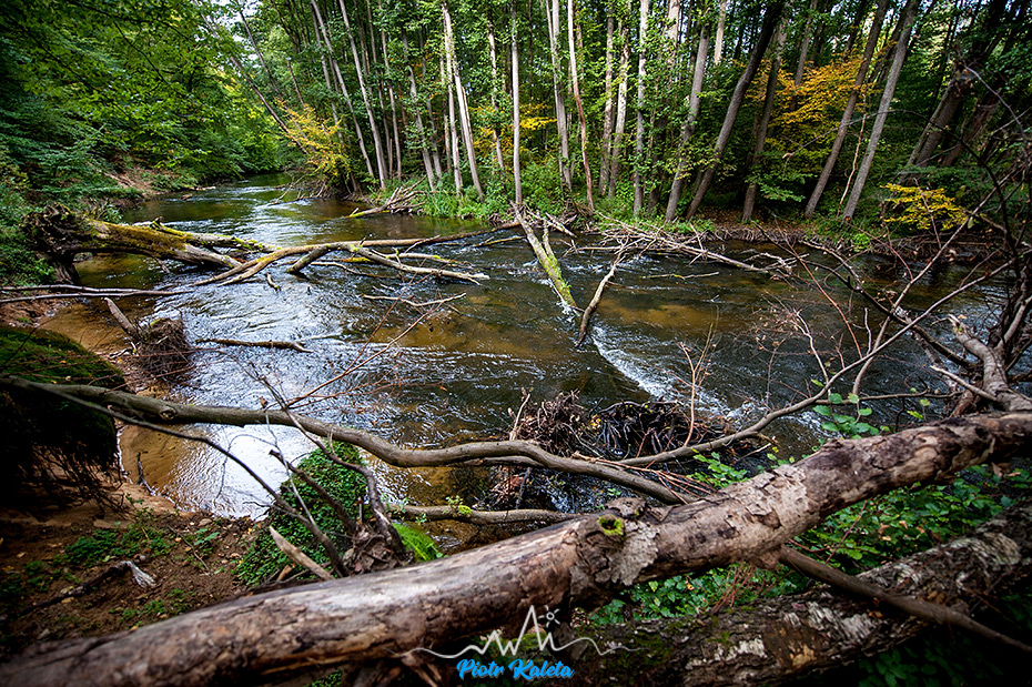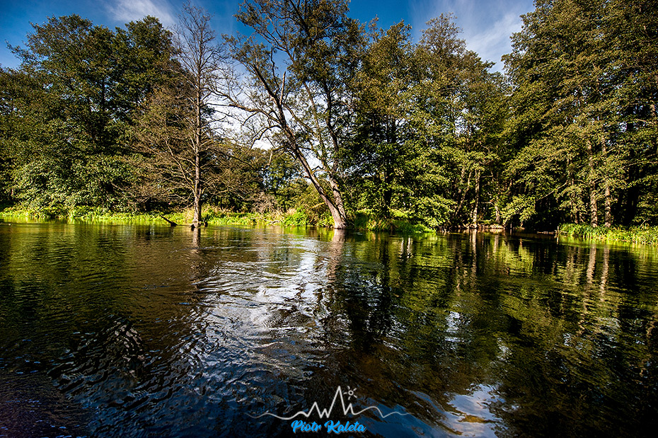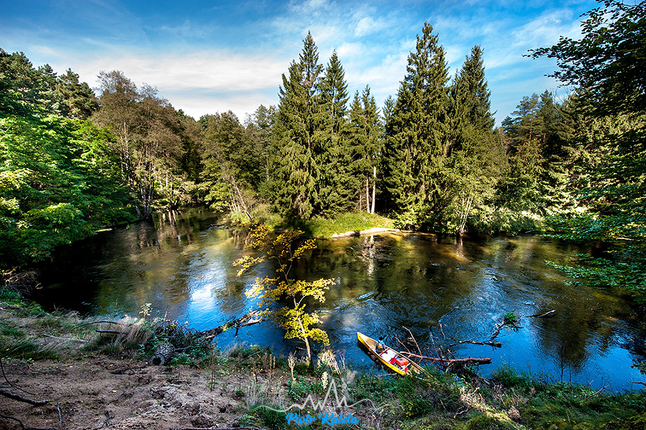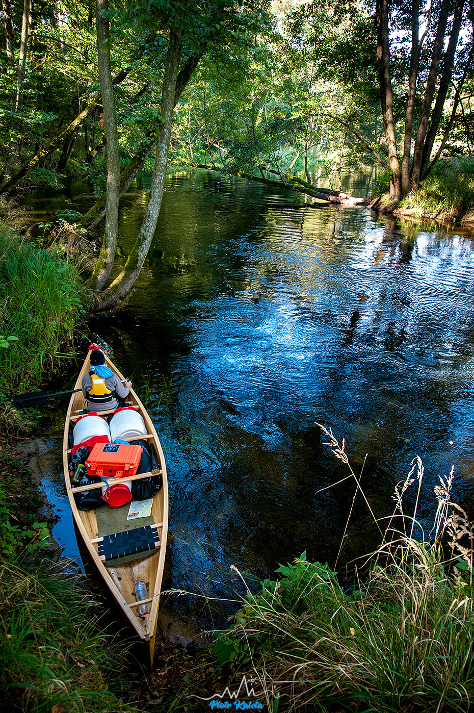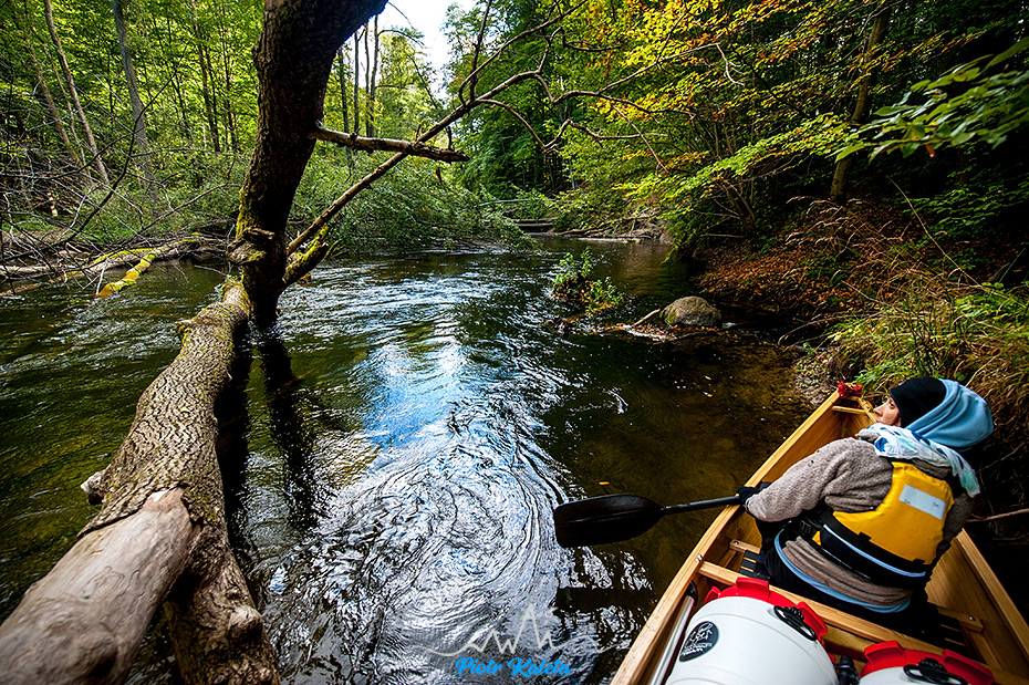 Mniej więcej od tej pory robi się zwałkowo, może nie tak jak na Łupawie czyli z częstym przenoszenie rzeczy brzegiem, ale już na tyle często, że prędkość spływu zdecydowanie spada. Jedno z przewróconych drzew funduje nam niezłą dawkę adrenaliny, bo okazuje się, że na szybkim w tym miejscu nurcie nie da się tak wymanewrować kanu by przeciągnąć je pod pniem. Adrenalina wiąże się z tym, że woda przypina nas do pnia i niebezpiecznie przechyla kanu w stronę nurtu w sytuacji w której trzeba je opróżnić z naszych rzeczy.
