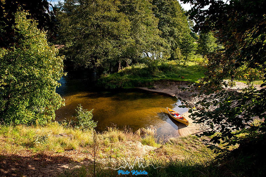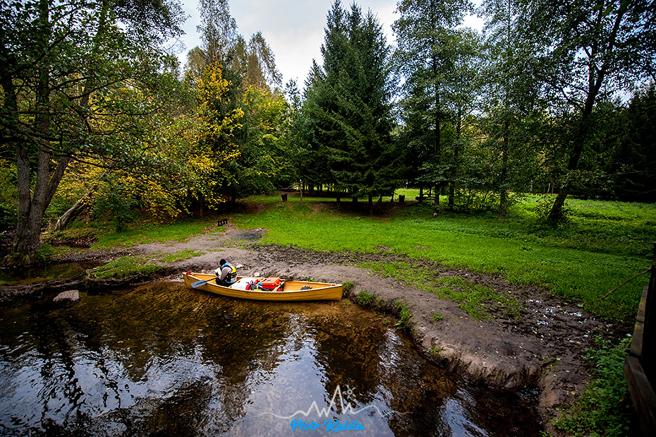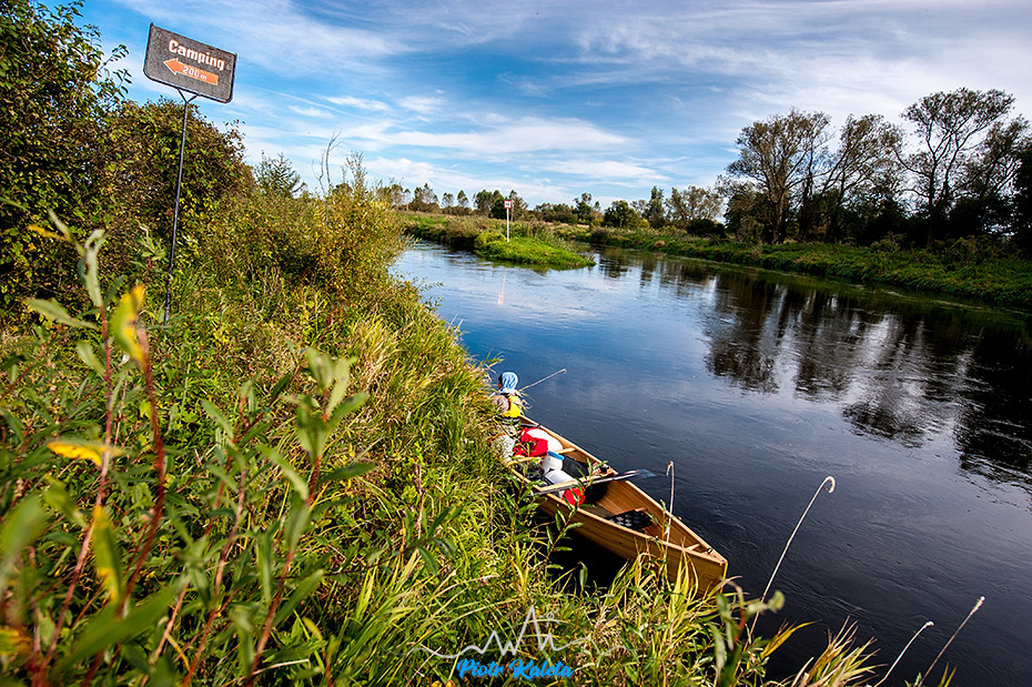 Do Rościna nic specjalnego na rzece czy przy niej się nie dzieje, natomiast od tej wioski mamy przed sobą towarzystwo w postaci pojedyńczego kajaka. Gdzieś 12.3o wpływamy na jezioro Siekiercze, a piszę o tym przede wszystkim dlatego, że tuż przed nim na lewym brzegu przy drewnianym mostku jest sobie fajnie położone i zadbane pole biwakowe. Jeżeli ktoś ma w planach rozpocząć spływ w godzinach popołudniowych to miejscówka aż się prosi o spędzenie tam nocy.
