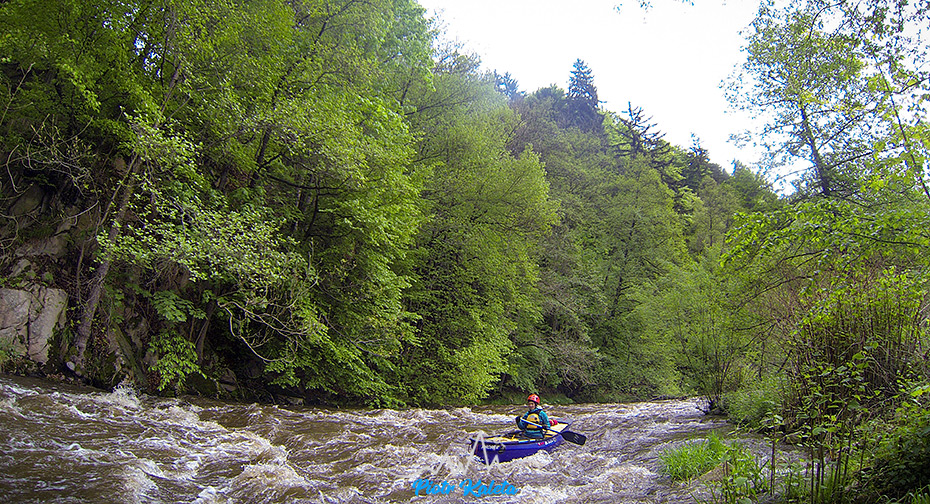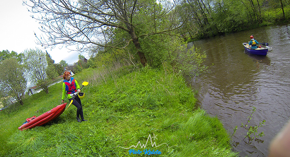 Andrzej go spływa, podobnie jak większość Czechów, ja takich rzeczy do tej pory nie robiłem a, że na tę chwilę zmieniać tego nie chcę, to z Myszką i Jolą obnosimy się prawym brzegiem. Poniżej stopnia na rzece robi się jeszcze ciekawiej niż do tej pory – spadek jest nieco większy a koryto węższe co z jednej strony wymusza uważne manewry z drugiej daje mi okazję by się pobawić w surfowanie a dla Myszki by trenować cofki. W końcu – jak by nie patrzeć – dla niej to dopiero drugi samodzielny dzień na wodzie a warunki do trenowania są naprawdę komfortowe : )