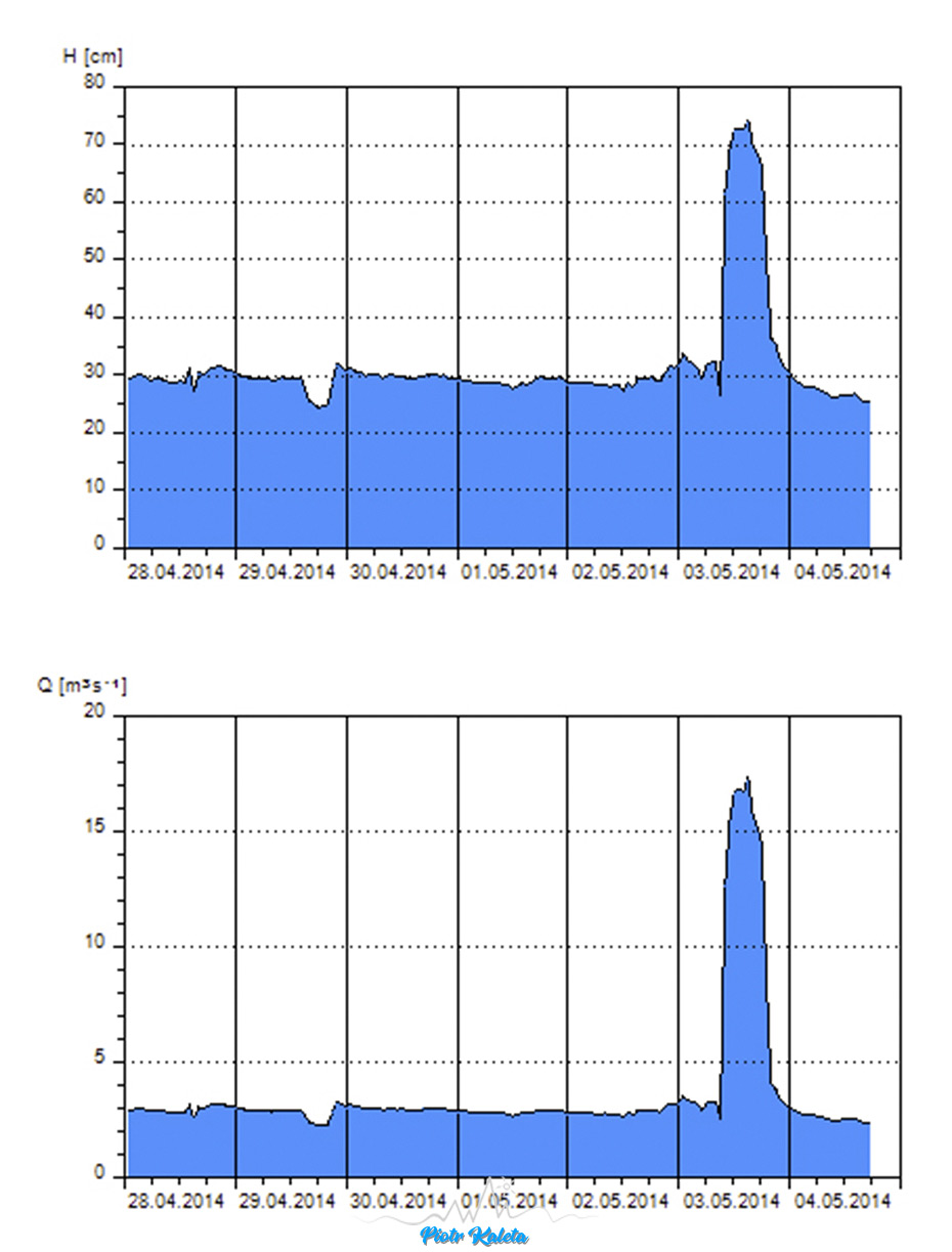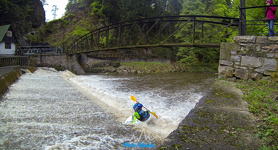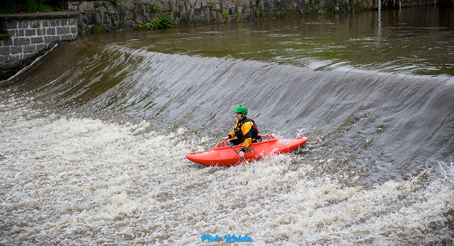 Ten dość malowniczy – choć mocno zurbanizowany – odcinek od razu przywołuje wspomnienia z ubiegłorocznej Armady i pływania na Sense. Dla mnie będzie pamiętny jeszcze o tyle, że gdzieś tam kończąc surfowanie przy wyjściu z jednej ze stojących fal tracę równowagę i zaliczam kabinę : ) No cóż – Divoka Orlice tylko zyskuje na szacunku : ) Stopień w Podstejnie ma szczęśliwie konstrukcję, która nie tworzy odwoju, więc po przeniesieniu Mysiego kanu poniżej niego i tym razem go spływam, a po tym jak już jestem na dole zaczynam tego gorąco żałować : (