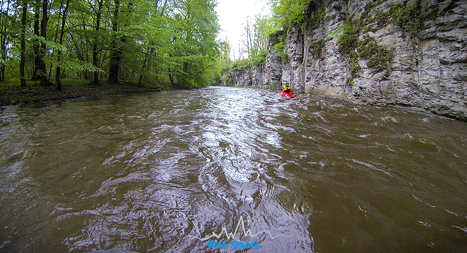 Popas zarządzony już poniżej zamku w Liticach nie jest zbyt długi – mimo, że jest już nawet słonecznie to wciąż jest dość chłodno – dość szybko znów jesteśmy na wodzie. Kolejny napotkany próg tym razem spływam, co jest dla mnie o tyle istotne, że coś takiego robię to po raz pierwszy w życiu : ) Oczywiście na brzegu tuż poniżej niego czeka z rzutką zwarta i gotowa i przeniesiona tam wcześniej Myszka. Na szczęście dość sprawnie przeskakuję nad odwojem i jej pomoc nie jest potrzebna. Na wysokości Brna lewy brzeg Orlicy przestaje być brzegiem a staje się pionową skalną ścianą.