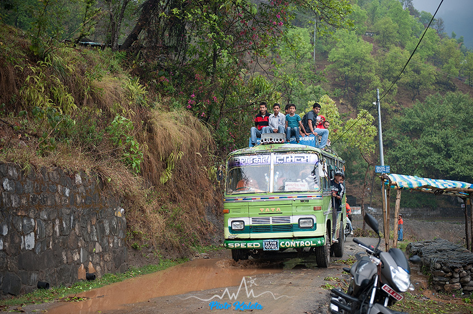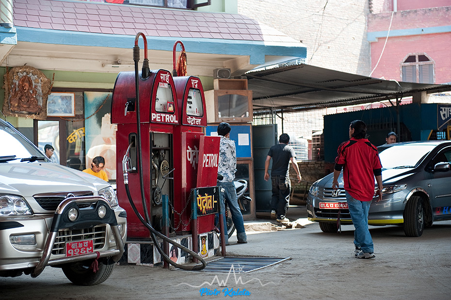 W oczekiwaniu na autobus do Dehli obserwujemy pracę pobliskiej stacji benzynowej. Nepalczycy to oszczędny naród (może dlatego, że z prądem są tu nieustanne problemy). Jak trzeba przepompować kilka- kilkanaście litrów to robią to ręcznie (to ta korbka przy dystrybutorze). Dopiero w przypadku zapotrzebowania na większą paliwa uruchamiają agregat zasilający pompę.