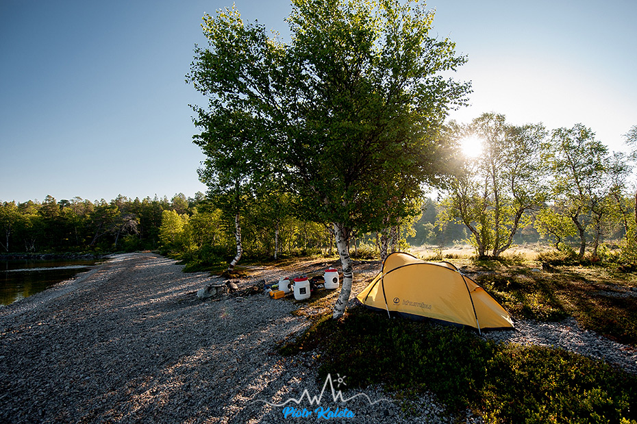 Wieczorne przeczucie potwierdziło się bo całkiem szybki strumień rozbija się po kamieniach i to właśnie jest ten dogłos słyszany z plaży. Przy pierwszej okazji przeskakuję na drugi brzeg i okrążam jeziorko celując w namiot. Po drodze trafiam na … wygódkę, taka normalną – drewnianą : ) Od niej do namiotu jest jeszcze ze sto metrów. Myszka już nie śpi, a ja biorę się za rozpalanie ogniska. Dzień zapowiada się gorący i spokojny, a ponieważ w planach na dziś mamy tylko dopłynięcie do zatoki Revlingodden i pozostanie tam na dwie noce, to będzie również leniwy.