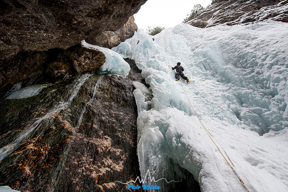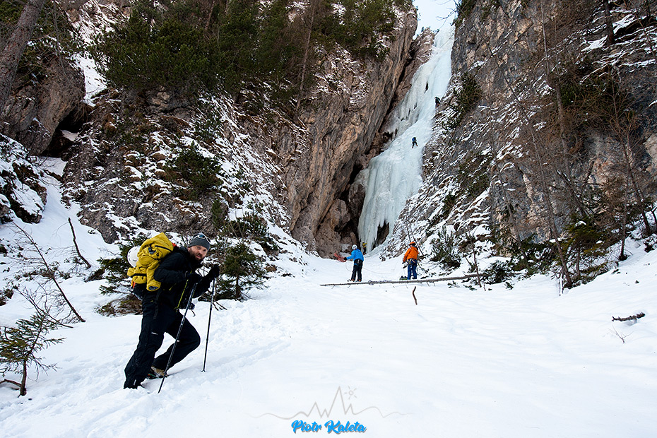 Wbijamy się oczywiście pod lodospad, który z drogi wygląda na najładniej wylany – Lujantę.
