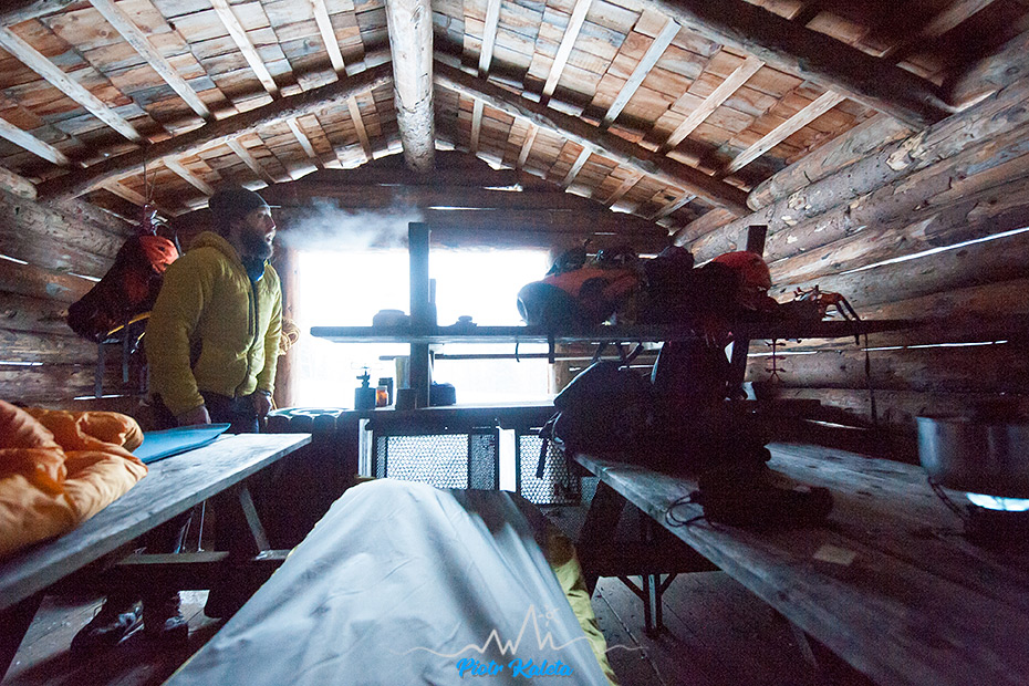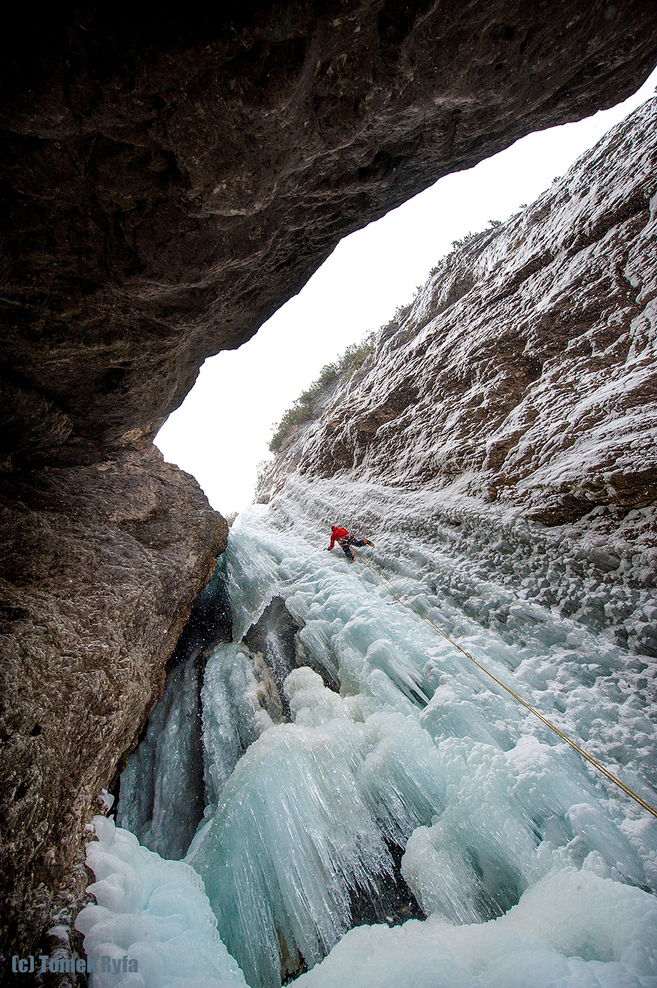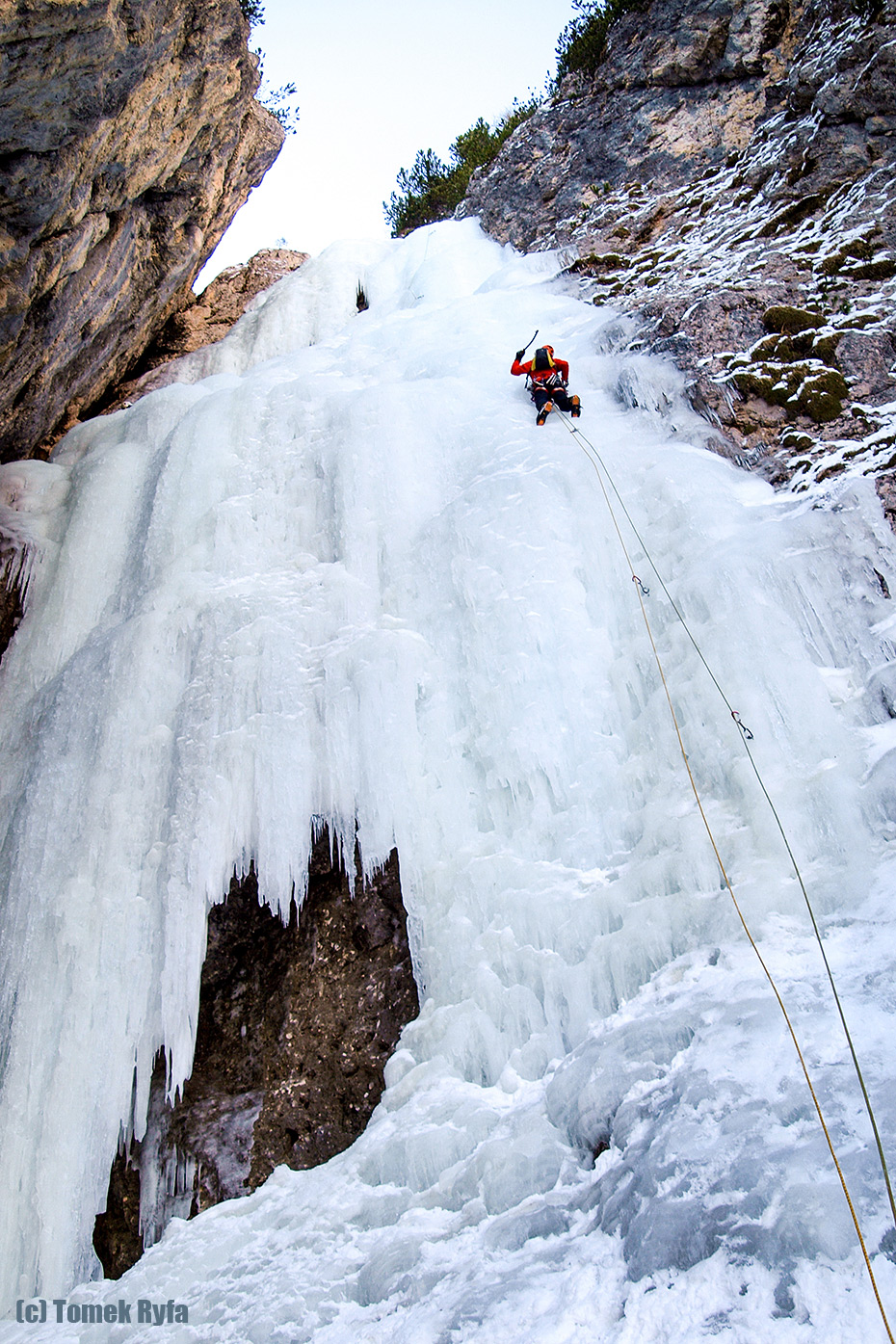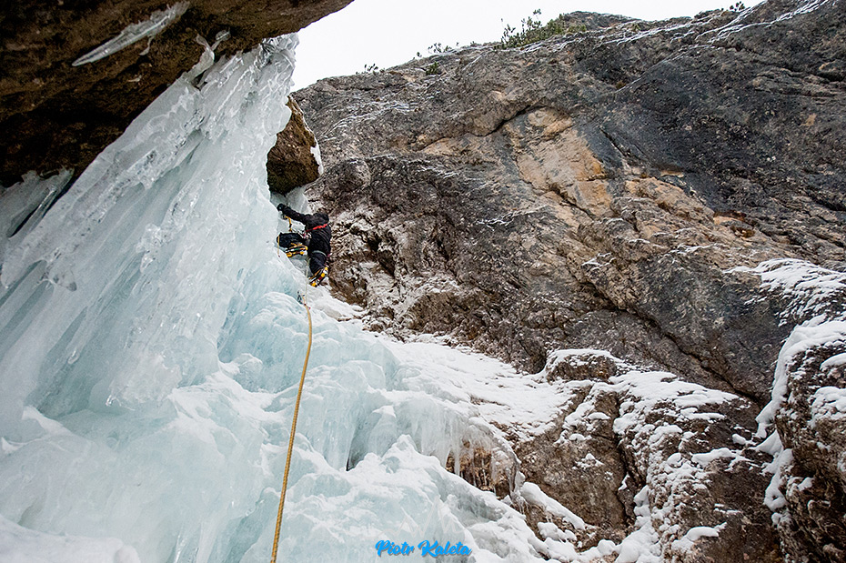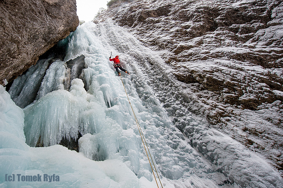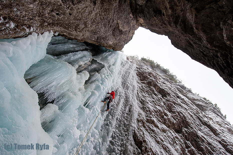 Powyżej Tomek na pierwszym, a poniżej ja na drugim wyciągu. Jak widać wylało znacznie gorzej. Jak się do tego doda odgłosy delikatnych tąpnięć lodu to wyjdzie, że wspinanie mimo takich se trudności było dość czujne. Stanowska nie rozpieszczają – dziś mamy wyłącznie haki i pętle. Pogoda też słabsza – delikatnie prószy śnieg.