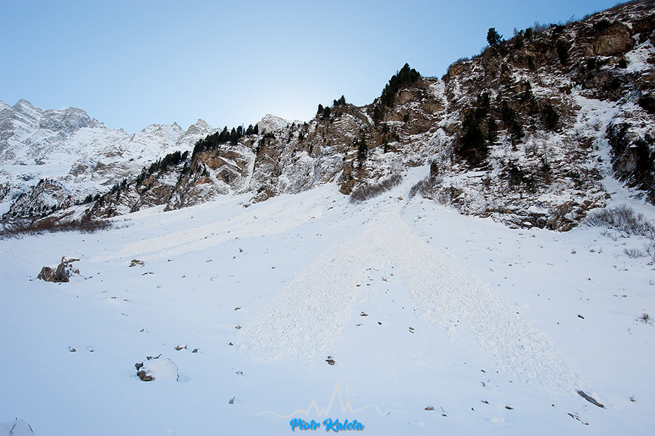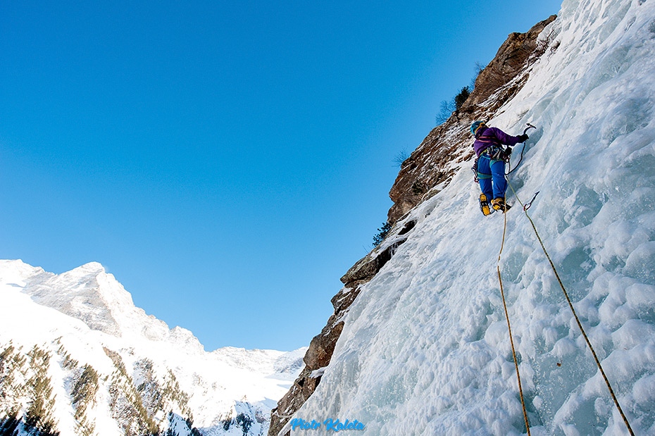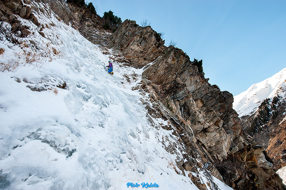 Początek to raczej spokojny trawers a po nim krótki i już dość pionowy lód. Z lewej bardzo pionowy z prawej nieco mniej. Wybieram prawą stronę i po kilku metrach mam wątpliwą przyjemność walczyć z wyjątkowo twardym tutaj lodem. Dość czujnie przewijam się przez próg i za nim wkręcam kolejną śrubę. Jeszcze tylko mały prożek i teren zaczyna się kłaść. Pozostaje już tylko znaleźć miejsce na założenie stanowiska, a to okazuje się wyzwaniem. Teren to zaśnieżona i zakrzaczona dość pionowa rynna, przez którą przebijam się do góry w poszukiwaniu jakiegoś drzewka. Coś tam się w końcu pojawia, tyle, że wcześniej słyszę, że lina się kończy! Masakra.