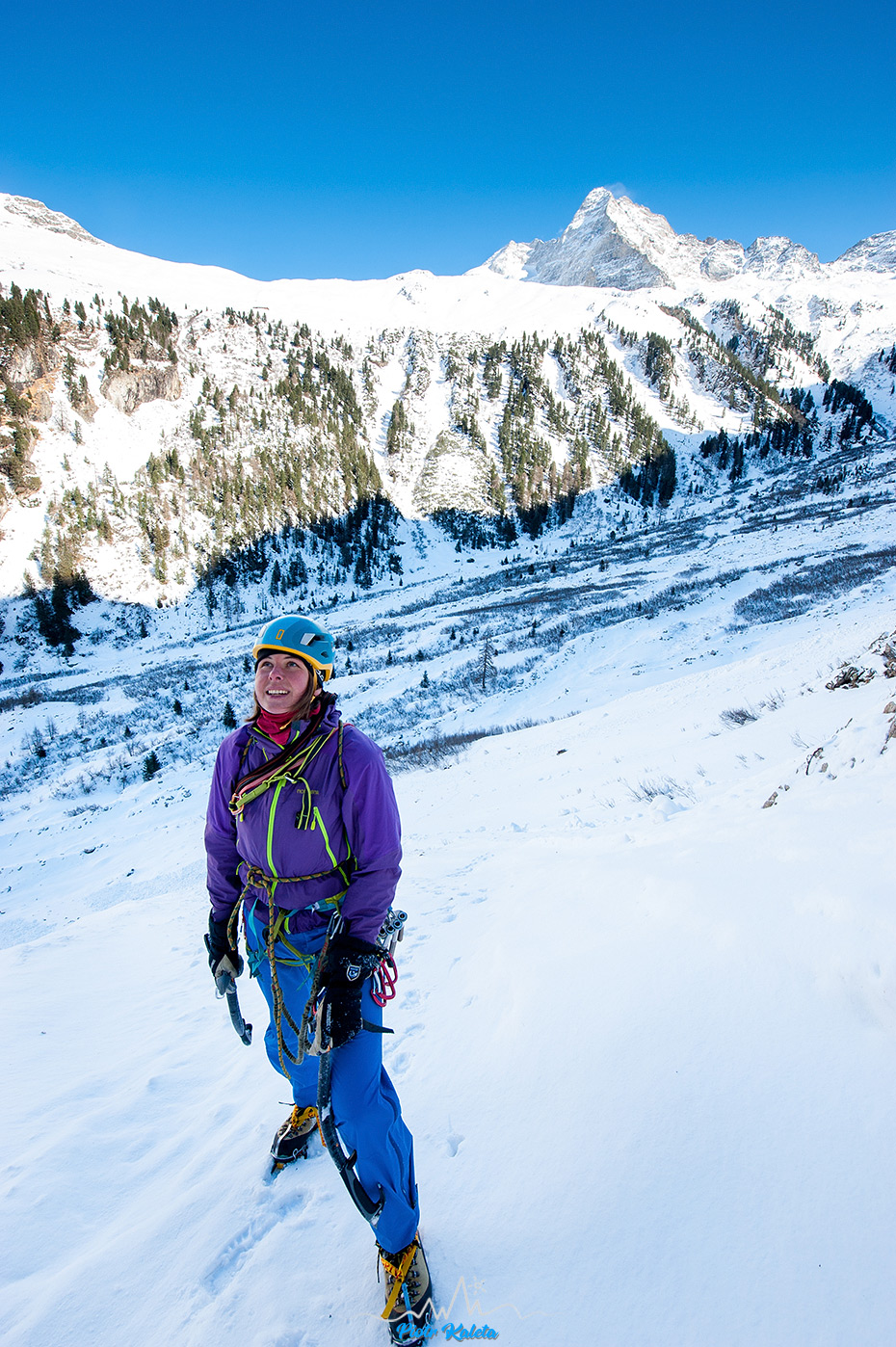 Magda ma ewidentną chrapkę na wspinanie i pierwszy odcinek lodu – 15-2o metrów za WI3 prowadzi właśnie ona. Po przełamaniu progu wyciąga niemożebnie dużo liny więc domyślam się, że jest tam jakiś prosty odcinek. I faktycznie dochodzę do niej po dość długiej śnieżnej rampie.