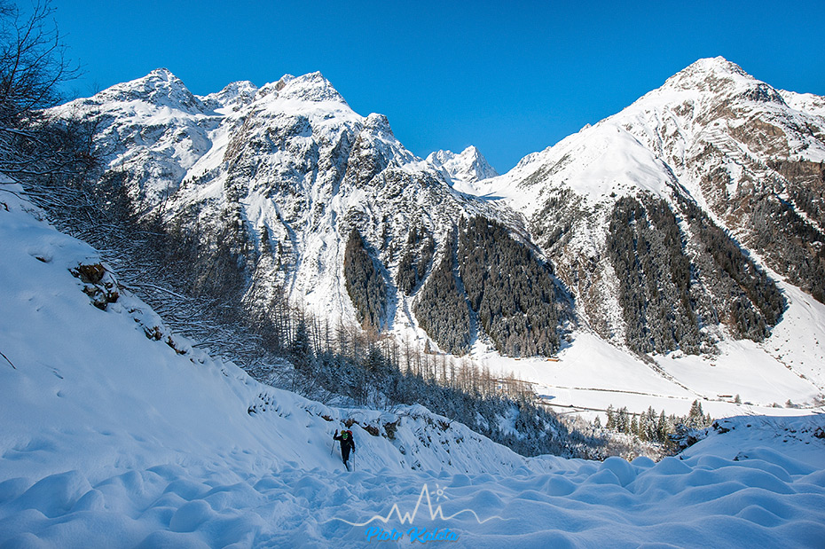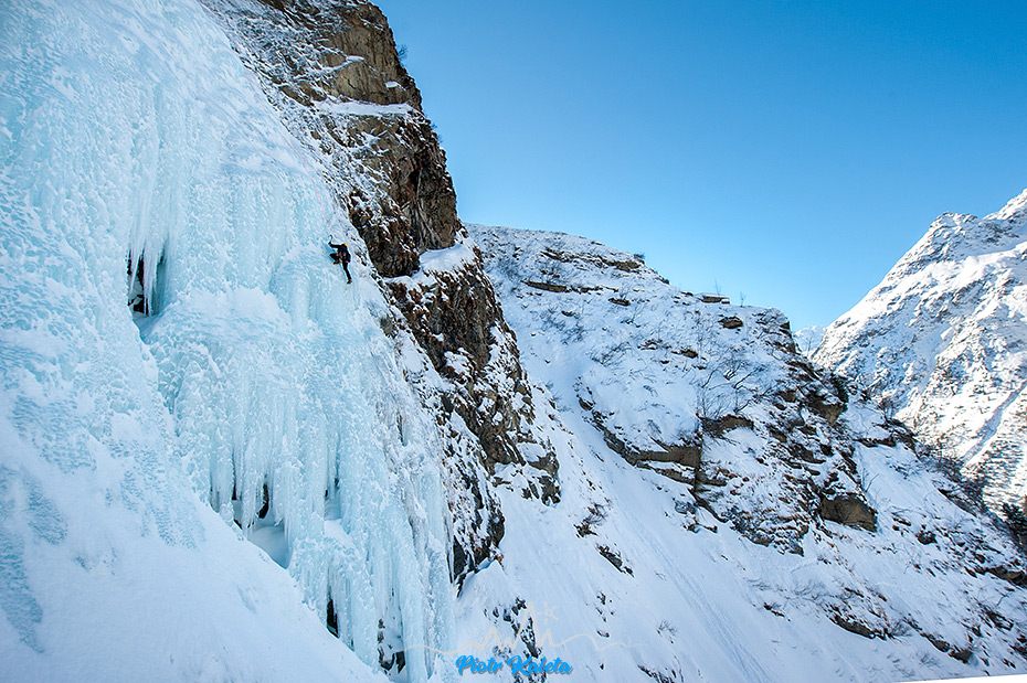 Pierwsze metry Bachtrattle można poprowadzić za WI 4+ ale można też za WI 3+. Po tak długiej przerwie jak ta którą zaliczam w tym sezonie i po tym jak Tomek nie daje się namówić na prowadzenie decyduję się na lewą stronę. Kombinuję tak: środkowa część lodospadu będzie trudniejsza i chcę mieć na niej zapas mocy. Kolejne metry urabiam dość szybko i na końcu krótkiego pola śnieżnego motam stan ze śrub. Tomek dochodzi dość sprawnie co w kontekście jego kontuzjowanej stopy i właśnie przechodzących “chrzest bojowy” nowych dziabek jest dobrą informacją. Zabieram szpej i kontynuuję.