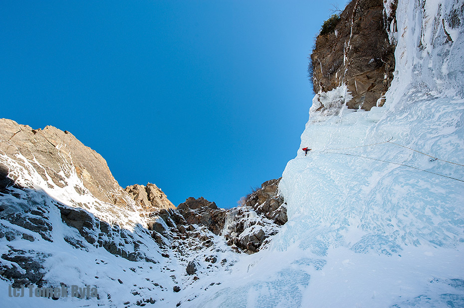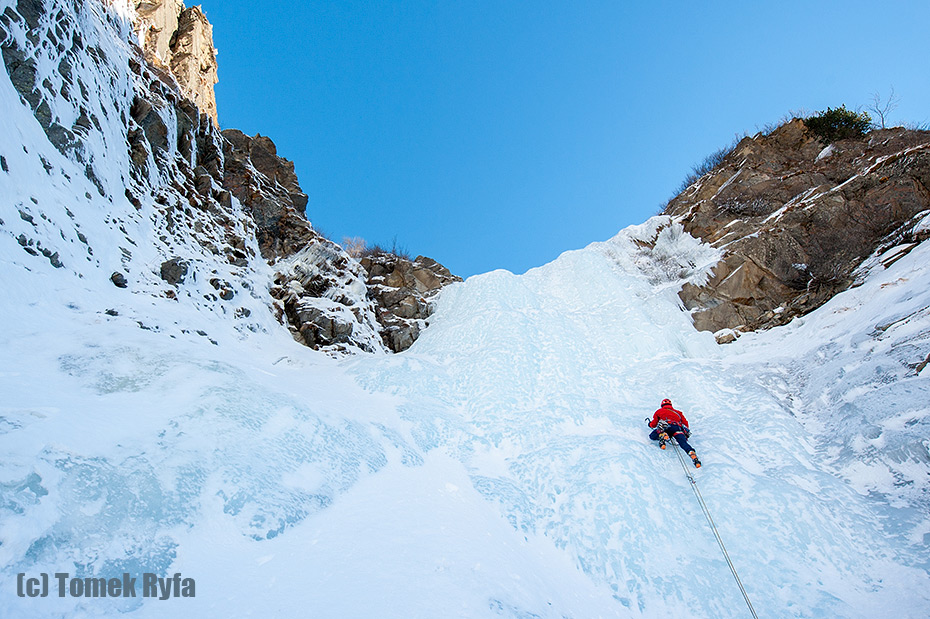 Tym razem jest bardziej pionowo ale lód jest nadal bardzo plastyczny, więc prowadzi mi się dobrze i nawet mnie specjalnie nie wybiera. W każdym razie zacięcie w środku tej partii lodospadu puszcza bez przygód. Chociaż nie, raz posyłałam w dół sporą miednicą a dwa czy trzy razy już mniejsze kawałki lodu. Miednica szczęśliwie omija Tomka ale jeden z mniejszych trafia go w ramię : ( Tomek dochodzi na raty, bo w międzyczasie zjazdy zaczyna zespół, który był przed nami i rzucona przez nich lina ląduje dokładnie między jego ramionami. Ostatnie piętro lodu jest już naprawdę proste – ciągnę szybko te ostatnie metry i motam stan przy zastanym abałaku. Pozostaje przygotować się do zjazdów, które zakończą nasze spotkanie z Bachtrattle.