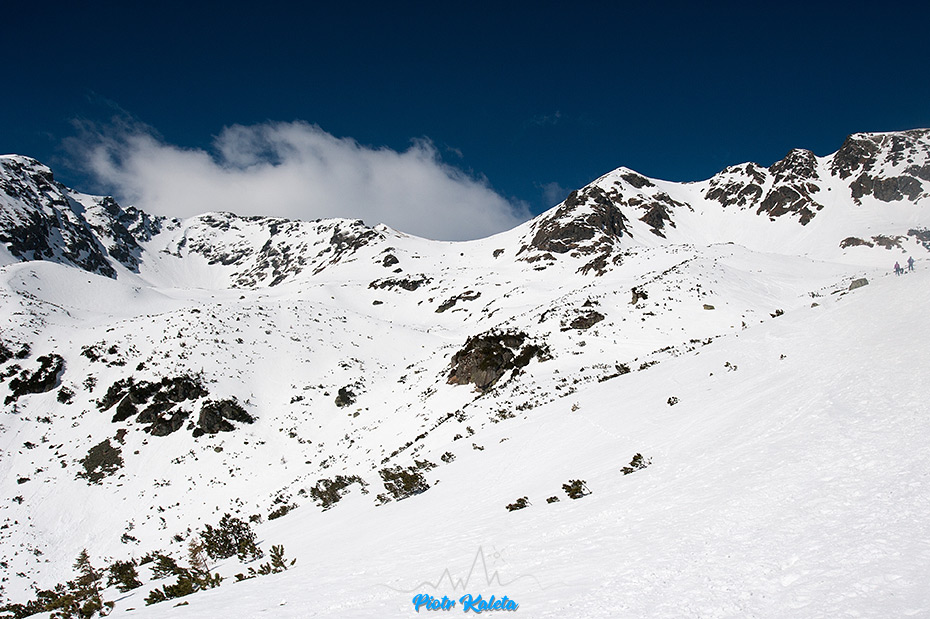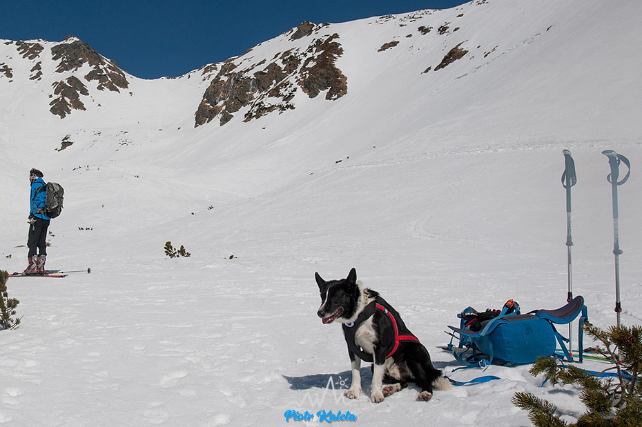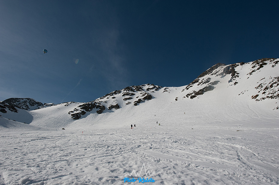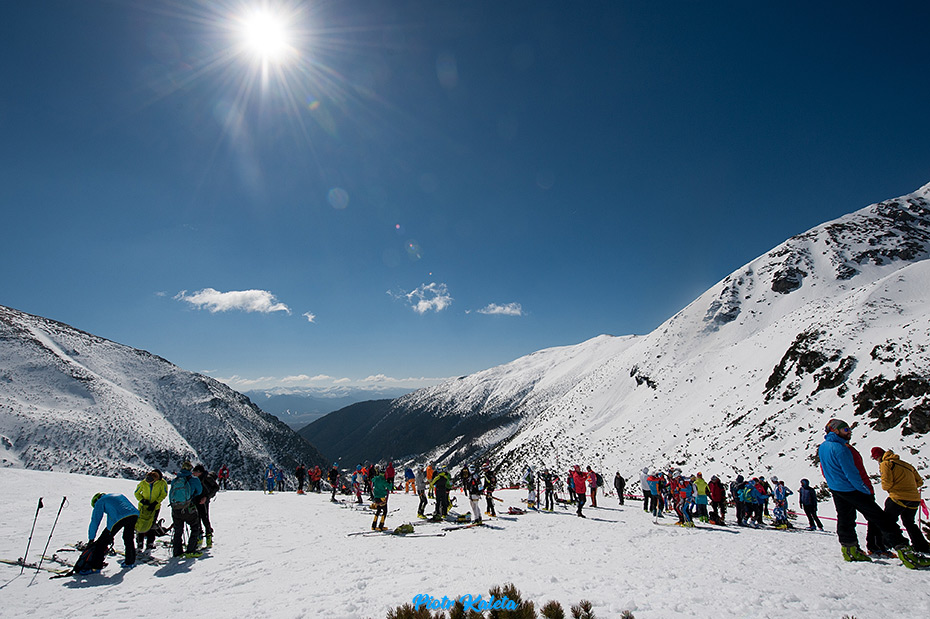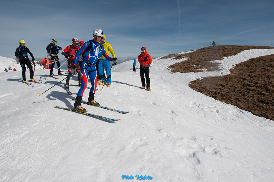 Jeden z widoków znad progu – sznur osób podchodzących na przełęcz między Banikovem a Hrubą Kopą jest podobny do tego jaki widzieliśmy wczoraj na podejściu jednym ze żlebów którym prowadził początek trasy zawodów. Dziś znów trafiamy … na zawody : ) Na szczęście na Smutną Przełęcz tłumy nie ciągną : )