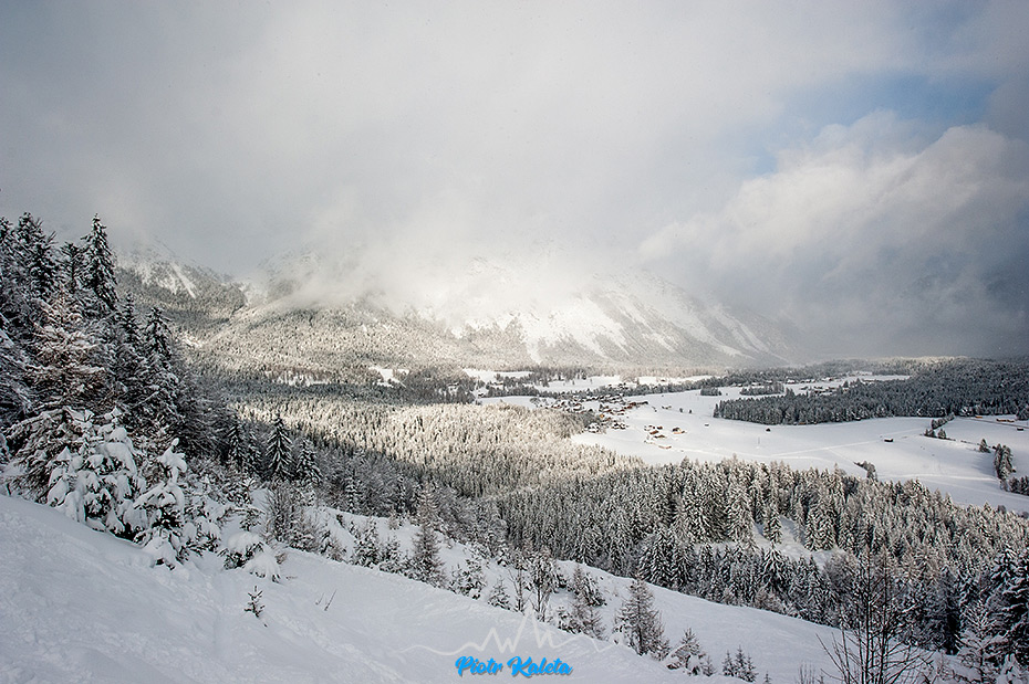 Seefeld / Rosshütte – inny rejon, inne okoliczności przyrody: fantastycznie pusta trasa na zachód od stoków z fajnymi widokami na Wetterstein (jak były przejaśnienia) i tłumy skiturowców(!) po wyjściu z lasu w okolicy sztucznego jeziorka “Kaltwaser”. Przez cały dzień to przewinęła się ich z setka – tak bez przesady – naprawdę mrowie luda. Poza tym start na 123om koniec na 1760m – czyli było co podejść i co zjechać, znaczy milusio : )