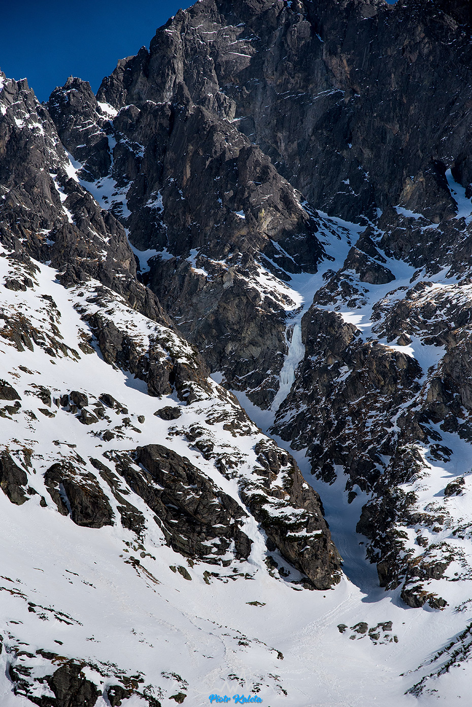 Podchodzimy lewą stroną żlebu starając się trzymać jak najbliżej skał i gdy jesteśmy dosłownie 4o może 5o metrów od znajdującego się po przeciwnej stronie lodospadu mówię: „dość”. Tomek nalega by założyć stan i już z taką asekuracją podejść pod lodospad, ale dochodzące do nas odgłosy kolejnych lawin sprawiają, że ja mam ochotę wyłącznie spier&$@#ć na dół. Ostatecznie staje na tym, że spadamy. Tuż przed „wrotami” natykamy się na inny zespół – trójkę rodaków. Idąca z nimi dziewczyna widząc, że się wycofujemy dołącza do nas. Tamci decydują się kontynuować podejście.
