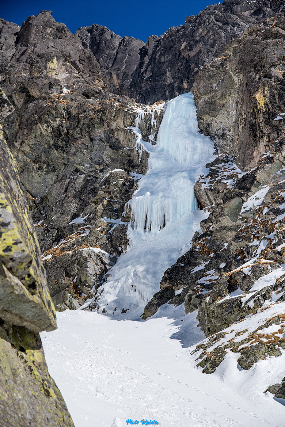 Z zainteresowaniem przyglądamy się też coraz to kolejnym skiturowcom, którzy pojawiają się u góry Żlebu Filmarskiego na trasie z Lomnickiego Sedla. Ich narty nieźle szorują po stoku co oznacza, że wszystko jest tam zmrożone. Kukamy też na dwójkę która podchodzi pod Cyklistický ľad, krótszy i – jak się wydaje z racji jego położenia – też mniej narażony na lawiny lodospad. Kolejne wyjeżdżające z przeciwnego stoku lawiny coraz bardziej podważają ideę, że to co robimy jest mądre. Na razie umawiam się z Tomkiem, że na wysokości skalnej bramy od której zaczyna się właściwa rynna zdecydujemy co dalej. Gdy dochodzimy do niej warunki nadal wyglądają na stabilne, więc mimo, że formacja ogólnie jest słaba to decydujemy się na dalsze podejście. W temacie pogody to zmienia się ona na tyle, że od dołu doliny zaczyna pełzać pierzyna z chmur i po jakimś czasie tracimy z oczu miejsce w którym opuściliśmy szlak do Terinki. Kolejne metry w górę to też rosnące przekonanie, że pchamy się w kłopoty. Na dodatek jest to przekonanie, które kompan raczej słabo podziela : (