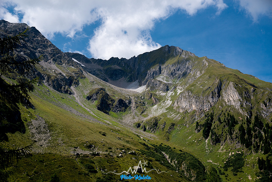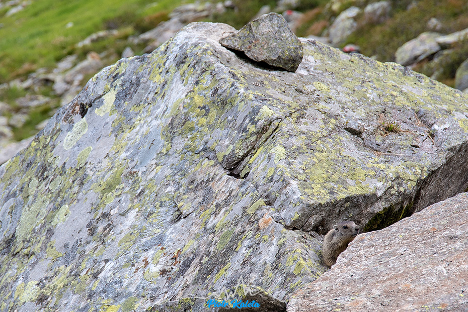 Po obiedzie szybko się pakujemy i ruszamy w stronę kumulującego poniżej na Wildschrofen (2142m) kolejnej grani. W połowie drogi do niej gdzieś w pobliżu rozlegają się gwizdy i Myszka wypatruje pierwszego świstaka.