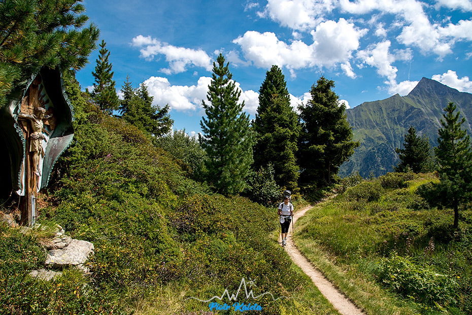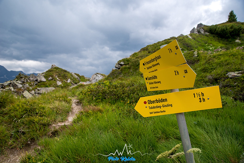 Do Gamshütte (1921m) docieramy w całkiem dobrym tempie. Tu robimy sobie oczywiście popas, a raczej po prostu się nawadniamy wpatrując w otaczające nas szczyty wśród których najbardziej na horyzoncie wybija się Dristner (2767m) oraz zmajstrowany pod gołym niebem … prysznic. Woda jest – Myszka sprawdziła, ale mimo, że byłby to dobry pomysł nie korzystamy z tej okazji. Przerwę wykorzystuję też na podładowanie jednej z komórek (na obu zapisuje ślad GPS). Nasz odpoczynek przerywa dość nagle to, że trafiam na drogowskaz informujący, że do Friesenberghaus – czyli schroniska w którym mamy zamiar spać jest … 9h! Szlag! Jest południe, wiec dojście jest realne pod warunkiem, że utrzymamy tempo. No nie ma co – deczko to nas mobilizuje do dalszego marszu ale też za sobą mamy jakiś kilometr podejścia do schroniska. Właściwy BHW w sumie zaczyna się dopiero teraz przy czym pierwsze gdzieś 2oom podejścia pokrywa się ze szlakiem na Vordere Grinbergspitze (2765m).