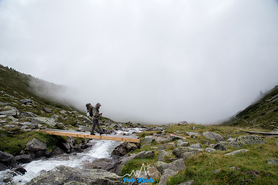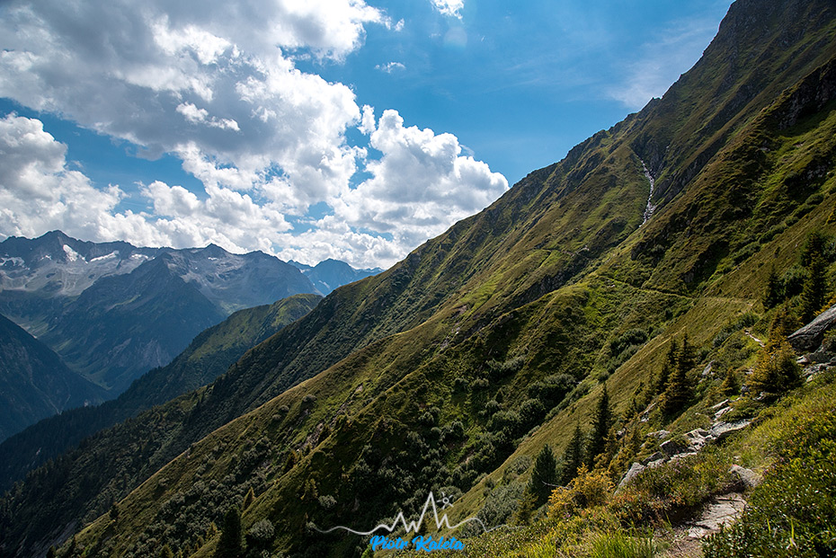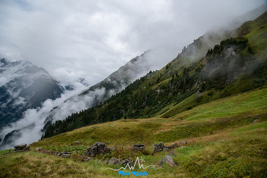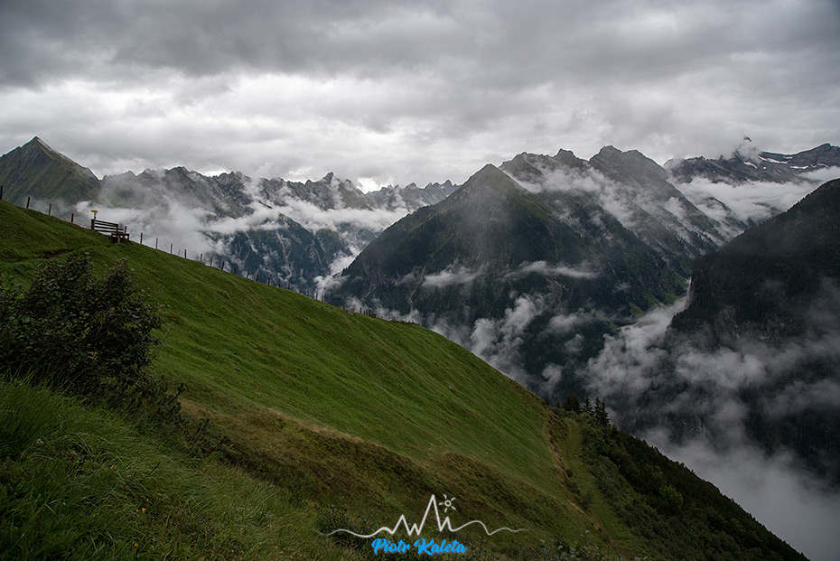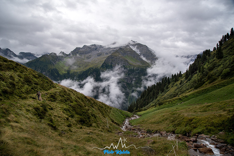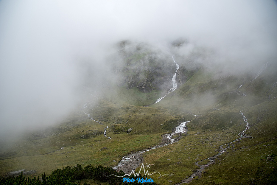 Widoczność jest taka sobie, choć gdy ścieżka przecina Lackenalm to przez chwilę wiać całkiem sporo i to co widzimy bardzo nam się podoba. Szkoda tylko, że po kilkunastu minutach znów wszystko ginie w chmurach : ( Gdy dochodzimy do Birglbergkar z przejaśnień wyłania się kilka naprawdę długich wodospadów – coś tam próbuję sfotografować, ale średnio mi to wychodzi.